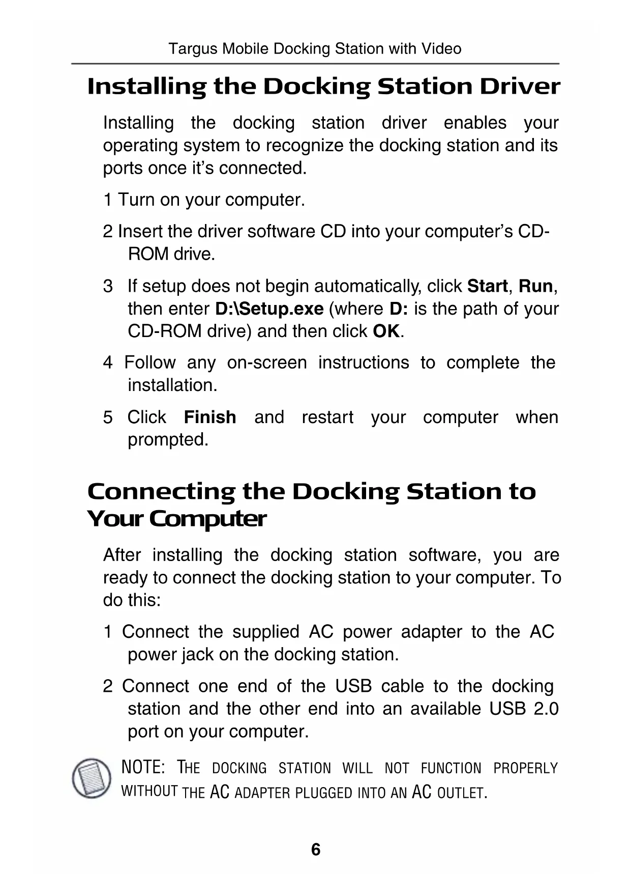Targus Mobile Docking Station with Video Installing the Docking Station Driver Installing the docking station driver enables your operating system to recognize the docking station and its ports once it’s connected. 1 Turn on your computer. 2 Insert the driver software CD into your computer’s CD- ROM drive. 3 If setup does not begin automatically, click Start, Run, then enter D:\Setup.exe (where D: is the path of your CD-ROM drive) and then click OK. 4 Follow any on-screen instructions to complete the installation. 5Click Finish and restart your computer when prompted. Connecting the Docking Station to Your Computer After installing the docking station software, you are ready to connect the docking station to your computer. To do this: 1 Connect the supplied AC power adapter to the AC power jack on the docking station. 2 Connect one end of the USB cable to the docking station and the other end into an available USB 2.0 port on your computer. NOTE: T HE DOCKING STATION WILL NOT FUNCTION PROPERLY WITHOUT THE AC ADAPTER PLUGGED INTO AN AC OUTLET.7 Targus Mobile Docking Station with Video DO NOT CONNECT ANY DEVICES TO THE DOCKING STATION UNTIL THE INSTALLATION IS COMPLETED. Installing the Default Device Drivers Once you connect the docking station to your computer, the default drivers begin installing for each of the ports. Some hardware devices may prompt you to install the drivers. To install the drivers: 1 Select Install the software automatically (Recommended) and click Next. The Found New Hardware Wizard program begins installing the hardware drivers. The Completing the Found New Hardware Wizard screen appears. 2Click Finish and repeat as needed for each device. 3 Restart your computer. LED Status Indicator Lights Once all device drivers are installed, the USB LED status indicator lights on the back of the docking station glow and you can connect devices to the docking station.