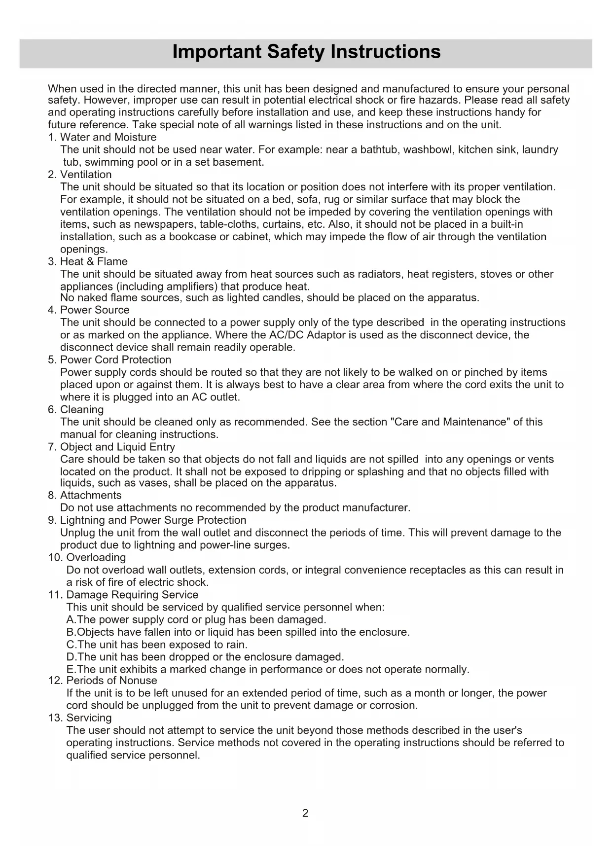 When used in the directed manner, this unit has been designed and manufactured to ensure your personal safety. However, improper use can result in potential electrical shock or fire hazards. Please read all safety and operating instructions carefully before installation and use, and keep these instructions handy for future reference. Take special note of all warnings listed in these instructions and on the unit.