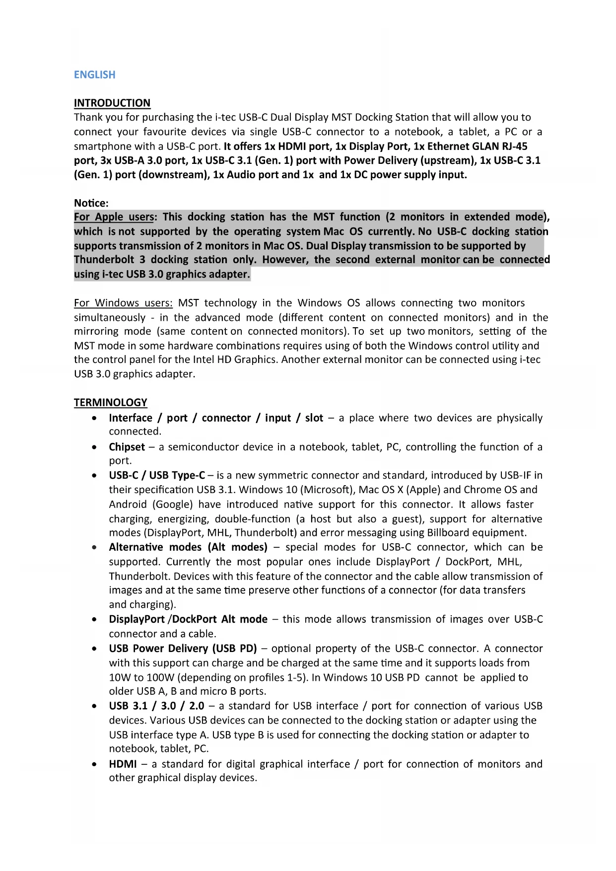 (GB) User's manual (DE) Gebrauchsanweisung (CZ) Manuál (SK) Manuál (LT) Vadovas (FR) Guide d’instructions et mode d’emploiENGLISH INTRODUCTION Thank you for purchasing the i-tec USB-C Dual Display MST Docking Station that will allow you to connect your favourite devices via single USB-C connector to a notebook, a tablet, a PC or a smartphone with a USB-C port. It offers 1x HDMI port, 1x Display Port, 1x Ethernet GLAN RJ-45 port, 3x USB-A 3.0 port, 1x USB-C 3.1 (Gen. 1) port with Power Delivery (upstream), 1x USB-C 3.1 (Gen. 1) port (downstream), 1x Audio port and 1x and 1x DC power supply input. Notice: For Apple users: This docking station has the MST function (2 monitors in extended mode), which is not supported by the operating system Mac OS currently. No USB-C docking station supports transmission of 2 monitors in Mac OS. Dual Display transmission to be supported by Thunderbolt 3 docking station only. However, the second external monitor can be connected using i-tec USB 3.0 graphics adapter. For Windows users: MST technology in the Windows OS allows connecting two monitors simultaneously - in the advanced mode (different content on connected monitors) and in the mirroring mode (same content on connected monitors). To set up two monitors, setting of the MST mode in some hardware combinations requires using of both the Windows control utility and the control panel for the Intel HD Graphics. Another external monitor can be connected using i-tec USB 3.0 graphics adapter. TERMINOLOGY Interface / port / connector / input / slot – a place where two devices are physically connected. Chipset – a semiconductor device in a notebook, tablet, PC, controlling the function of a port. USB-C / USB Type-C – is a new symmetric connector and standard, introduced by USB-IF in their specification USB 3.1. Windows 10 (Microsoft), Mac OS X (Apple) and Chrome OS and Android (Google) have introduced native support for this connector. It allows faster charging, energizing, double-function (a host but also a guest), support for alternative modes (DisplayPort, MHL, Thunderbolt) and error messaging using Billboard equipment. Alternative modes (Alt modes) – special modes for USB-C connector, which can be supported. Currently the most popular ones include DisplayPort / DockPort, MHL, Thunderbolt. Devices with this feature of the connector and the cable allow transmission of images and at the same time preserve other functions of a connector (for data transfers and charging). DisplayPort /DockPort Alt mode – this mode allows transmission of images over USB-C connector and a cable. USB Power Delivery (USB PD) – optional property of the USB-C connector. A connector with this support can charge and be charged at the same time and it supports loads from 10W to 100W (depending on profiles 1-5). In Windows 10 USB PD cannot be applied to older USB A, B and micro B ports. USB 3.1 / 3.0 / 2.0 – a standard for USB interface / port for connection of various USB devices. Various USB devices can be connected to the docking station or adapter using the USB interface type A. USB type B is used for connecting the docking station or adapter to notebook, tablet, PC. HDMI – a standard for digital graphical interface / port for connection of monitors and other graphical display devices. Audio – designation for audio input (microphone) or output (earphones / loudspeakers) devices. Please carefully read the entire manual before starting work with the docking station. More information can be found in the manual on our website www.i-tec-europe.eu in the tab “Download” for this product. SPECIFICATION 1x USB-C 3.1 (Gen. 1) port for data transfer, transfer rate up to 5 Gbps; connecting another monitor using this port is not supported, this can be achieved using Thunderbolt 3 docking station. 3x USB-A 3.0 port, transfer rate up to 5 Gbps; USB 3.0 port on front panel is with BC 1.2 specification 1x USB-C Power Delivery with profile 4 (max. 60 W) for connecting to your laptop or tablet 1x Ethernet GLAN RJ-45 port, 10/100/1000 Mbps Graphic interface: One monitor: 1x HDMI max. resolution 3840x2160/30Hz or 1x Display Port max. resolution 3840x2160/30Hz Two monitors (MST): supports up to 1920x1200/60Hz 1x Audio/Microphone 2.1 Jack Mode: Extend, Mirror and Primary Display Supported colors 16 / 32 bit Power supply from external power adapter – output: DC 20V/5A OS: Requires USB-C interface with "DisplayPort Alternate Mode" and „Power Delivery“ support (not all devices / systems with USB-C interface support the standard) or Thunderbolt 3 port – Windows 10 32/64bit, Mac OS X, Chrome OS and Android 6 (Google) with Intel Broadwell Processor and R51 and higher Product dimensions: 155 x 85 x 27 mm Product weight: 172 g PACKAGE CONTENTS i-tec USB-C MST docking station USB-C cable (100 cm) Power adapter (output: DC 20V/5A, max.100W, DC cable 200 cm + network cable 200 cm) Quick Start