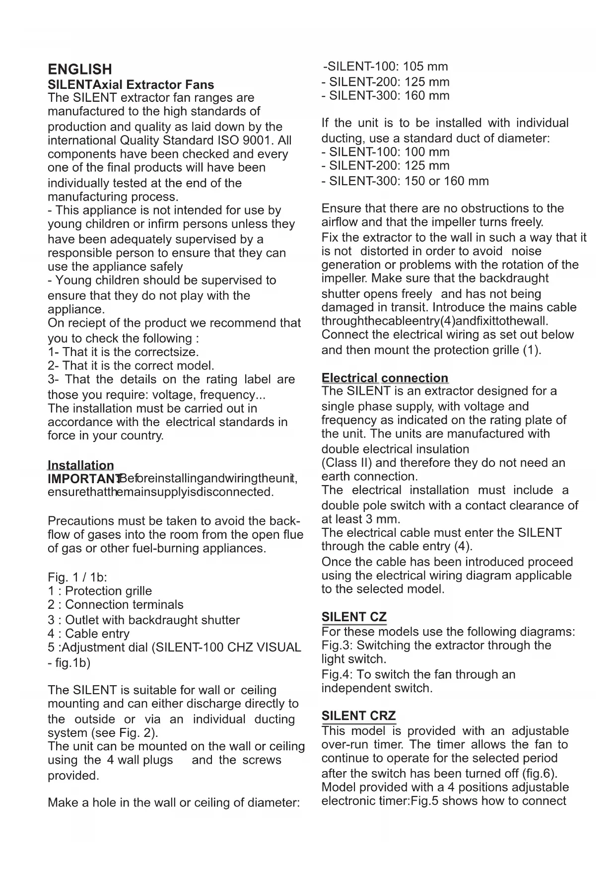 Fix the extractor to the wall in such a way that it is not distorted in order to avoid noise generation or problems with the rotation of the impeller. Make sure that the backdraught shutter opens freely and has not being damaged in transit. Introduce the mains cable through the cable entry(4)andfixittothewall.