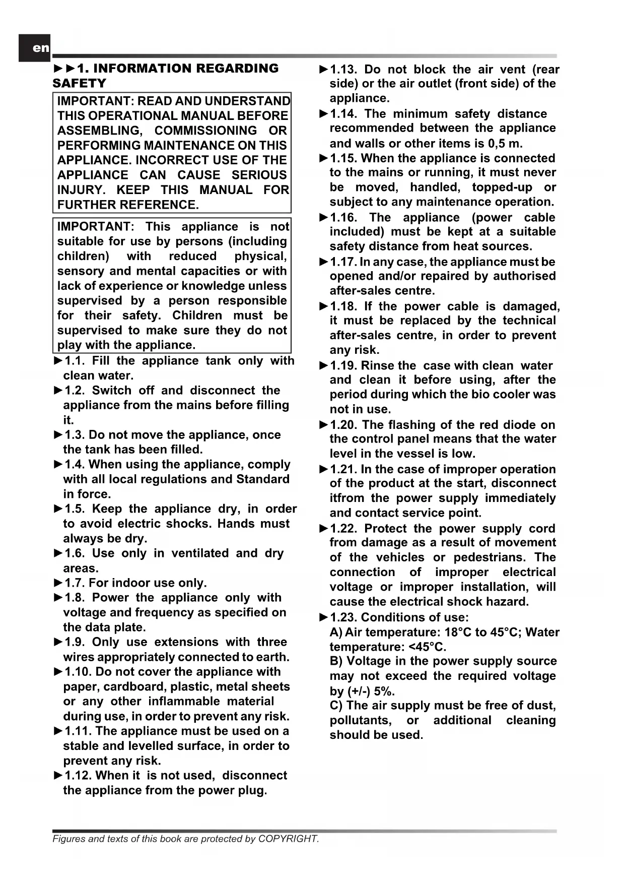 FURTHER REFERENCE. IMPORTANT: This appliance is not suitable for use by persons (including children) with reduced physical, sensory and mental capacities or with lack of experience or knowledge unless supervised by a person responsible for their safety. Children must be supervised to make sure they do not play with the appliance. ►1.1. Fill the appliance tank only with clean water. ►1.2. Switch off and disconnect the appliance from the mains before lling it. ►1.3. Do not move the appliance, once the tank has been lled. ►1.4. When using the appliance, comply with all local regulations and Standard in force. ►1.5. Keep the appliance dry, in order to avoid electric shocks. Hands must always be dry. ►1.6. Use only in ventilated and dry areas. ►1.7. For indoor use only. ►1.8. Power the appliance only with voltage and frequency as specied on the data plate. ►1.9. Only use extensions with three wires appropriately connected to earth. ►1.10. Do not cover the appliance with paper, cardboard, plastic, metal sheets or any other inammable material during use, in order to prevent any risk. ►1.11. The appliance must be used on a stable and levelled surface, in order to prevent any risk. ►1.12. When it is not used, disconnect the appliance from the power plug. ►1.13. Do not block the air vent (rear side) or the air outlet (front side) of the appliance. ►1.14. The minimum safety distance recommended between the appliance and walls or other items is 0,5 m. ►1.15. When the appliance is connected to the mains or running, it must never be moved, handled, topped-up or subject to any maintenance operation. ►1.16. The appliance (power cable included) must be kept at a suitable safety distance from heat sources. ►1.17. In any case, the appliance must be opened and/or repaired by authorised after-sales centre. ►1.18. If the power cable is damaged, it must be replaced by the technical after-sales centre, in order to prevent any risk. ►1.19. Rinse the case with clean water and clean it before using, after the period during which the bio cooler was not in use. ►1.20. The ashing of the red diode on the control panel means that the water level in the vessel is low. ►1.21. In the case of improper operation of the product at the start, disconnect itfrom the power supply immediately and contact service point. ►1.22. Protect the power supply cord from damage as a result of movement of the vehicles or pedestrians. The connection of improper electrical voltage or improper installation, will cause the electrical shock hazard. ►1.23. Conditions of use: A) Air temperature: 18°C to 45°C; Water temperature: <45°C. B) Voltage in the power supply source may not exceed the required voltage by (+/-) 5%. C) The air supply must be free of dust, pollutants, or additional cleaning should be used. Figures and texts of this book are protected by COPYRIGHT.en ►►2. UNPACKING ►2.1. Remove all packaging materials used to wrap and deliver the appliance and dispose of them in compliance with the Standards in force. ►2.2. Extract all items from the packaging. ►2.3. Verify if damage undergone during transport. If the appliance appears damaged, inform the dealer, where the purchase was made, immediately. ►►3. ASSEMBLY The device is equipped with wheels to facilitate handling. Depending on the model, wheels can be found already installed or not. Components equipped with relative nuts and bolts are found inside the packaging (Fig. 1). ►►4. OPERATION
