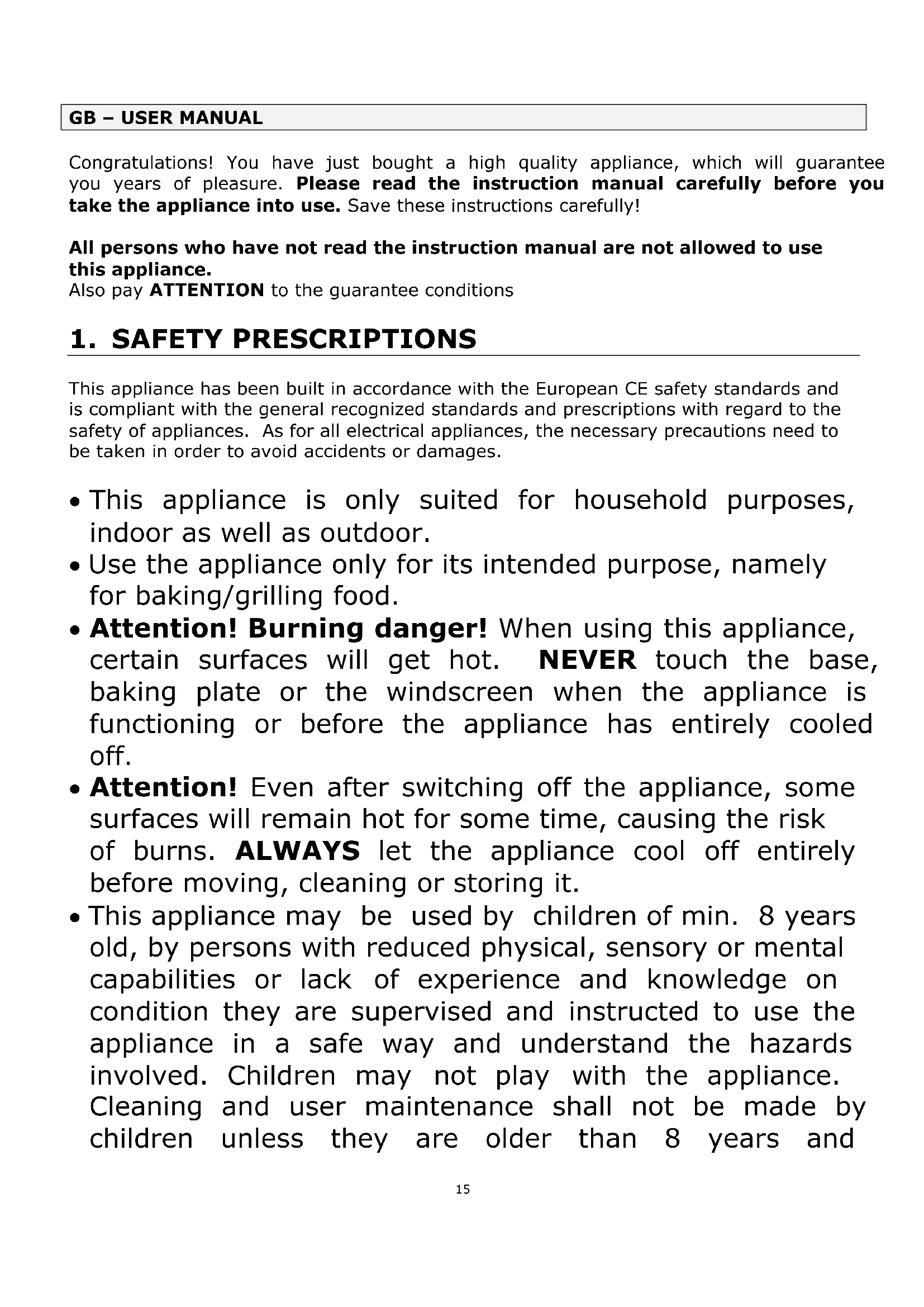 - Attention! Burning danger! When using this appliance, certain surfaces will get hot. NEVER touch the base, baking plate or the windscreen when the appliance is functioning or before the appliance has entirely cooled off.