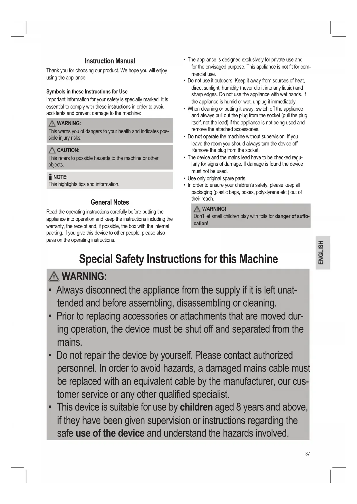 This warns you of dangers to your health and indicates pos- sible injury risks. CAUTION: This refers to possible hazards to the machine or other objects. NOTE: This highlights tips and information. General Notes Read the operating instructions carefully before putting the appliance into operation and keep the instructions including the warranty, the receipt and, if possible, the box with the internal packing. If you give this device to other people, please also pass on the operating instructions. Special Safety Instructions for this Machine