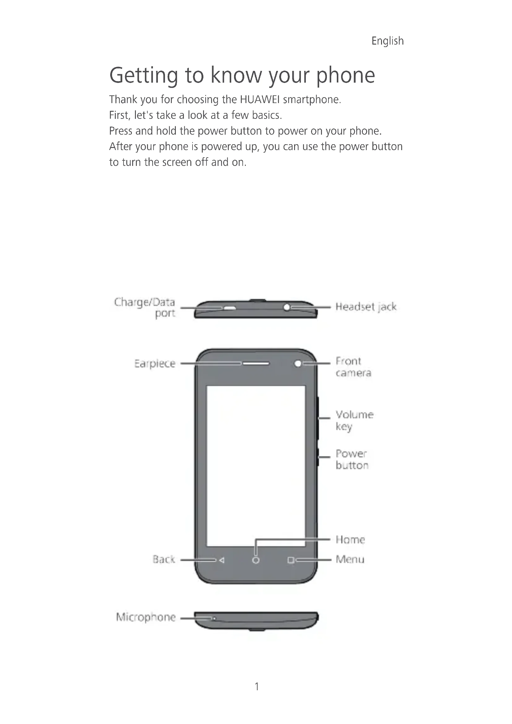 Getting to know your phone Thank you for choosing the HUAWEI smartphone. First, let's take a look at a few basics. Press and hold the power button to power on your phone. After your phone is powered up, you can use the power button to turn the screen off and on.2 Preparing your phone To insert the SIM card, the battery and a microSD card, please perform the few steps shown in the following figures. Your phone is shipped with the battery partially charged. It is recommended that you fully charge the battery before using it for the first time.3 For more help Please visit http://consumer.huawei.com/en/support/hotline/ for recently updated hotline and email address in your country or region. Personal information and data security The use of some functions or third-party applications on your device could result in your personal information and data being lost or becoming accessible to others. Several measures are recommended to help you protect personal and confidential information.
