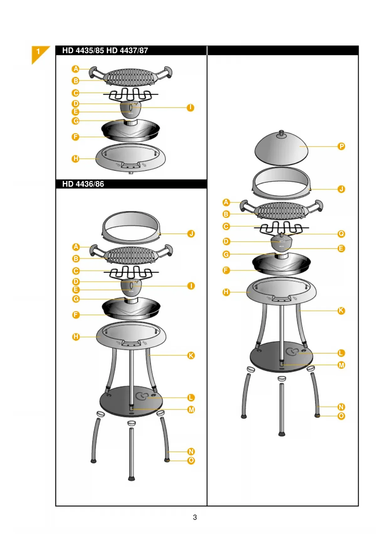 - Avoid touching the heating element.General description (fig. 1 on page 3) All types: A Handgrips B Grill C Heating element D Pilot light E Control panel (fixed to heating element) F Inner tray (chrome plated steel) G Filling aperture (for filling (up) with water) H Outer tray With types HD 4435/85 and HD 4436/86 only: I On/Off switch With types HD 4436/86 and HD 4437/87 only: J Wind screen K Legs: upper sections L Shelf (for e.g. barbecue utensils) M Joints N Legs: lower sections O Feet With type HD 4437/87 only: P Hood Q On/Off switch with heat control. (Rotate clockwise for higher temperature.) Assembling