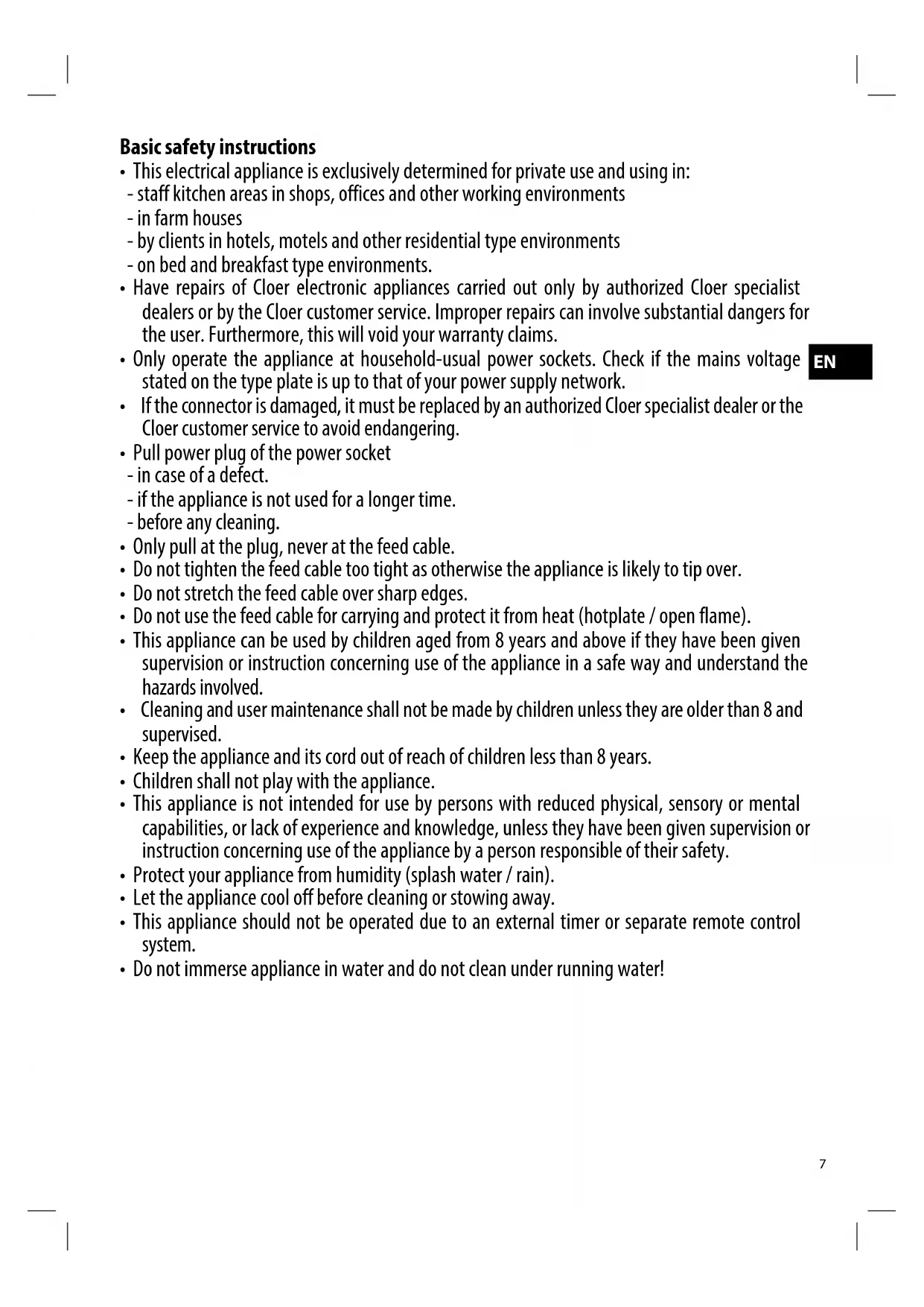 - Have repairs of Cloer electronic appliances carried out only by authorized Cloer specialist dealers or by the Cloer customer service. Improper repairs can involve substantial dangers for the user. Furthermore, this will void your warranty claims.