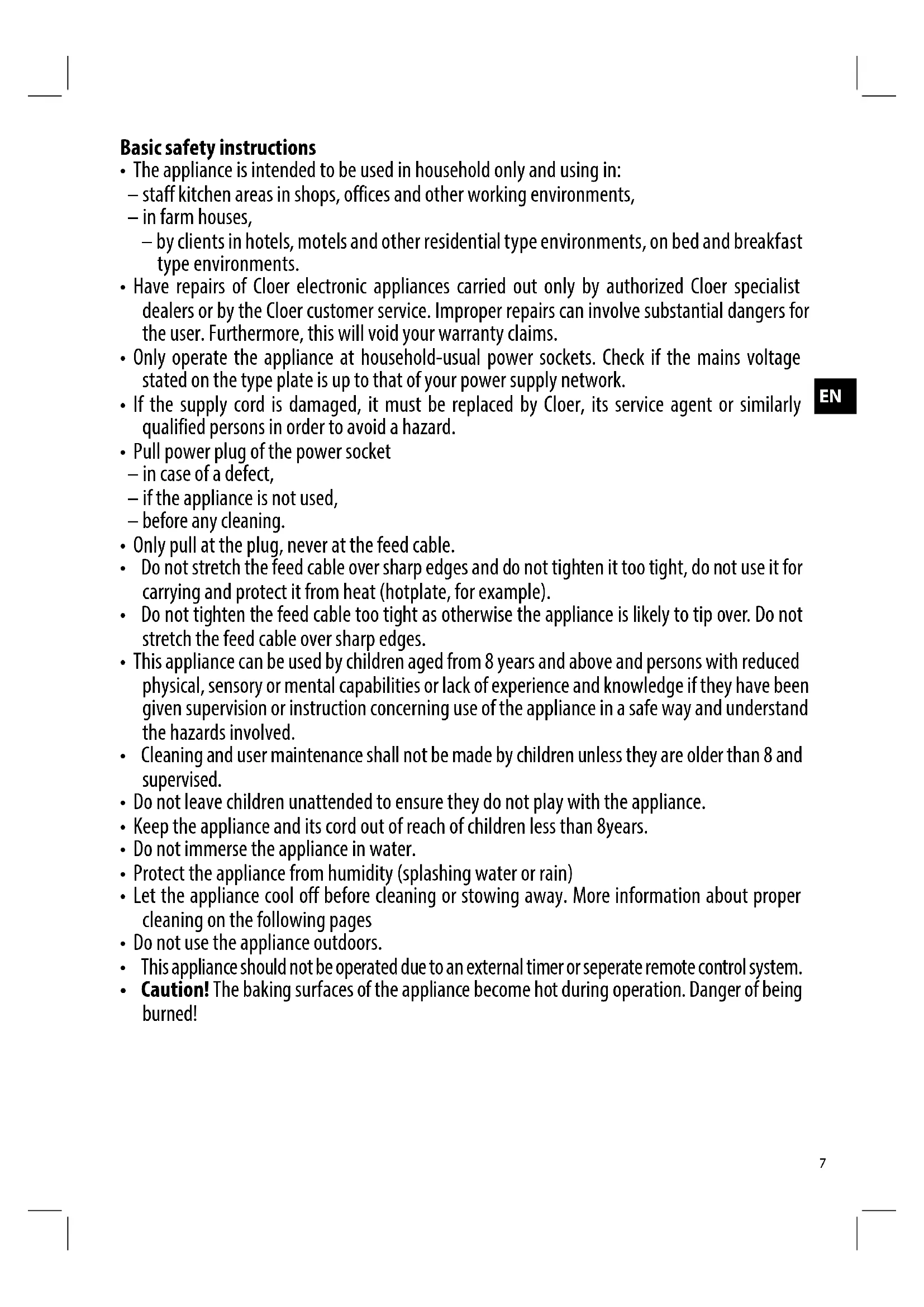 Cloer electrical appliances are in conformity with the currently required EC-guidelines and safety regulations. If your Cloer electrical appliance has a defect or it does not work properly, contact your specialist dealer. Registered clients have at their disposal our technical customer service.