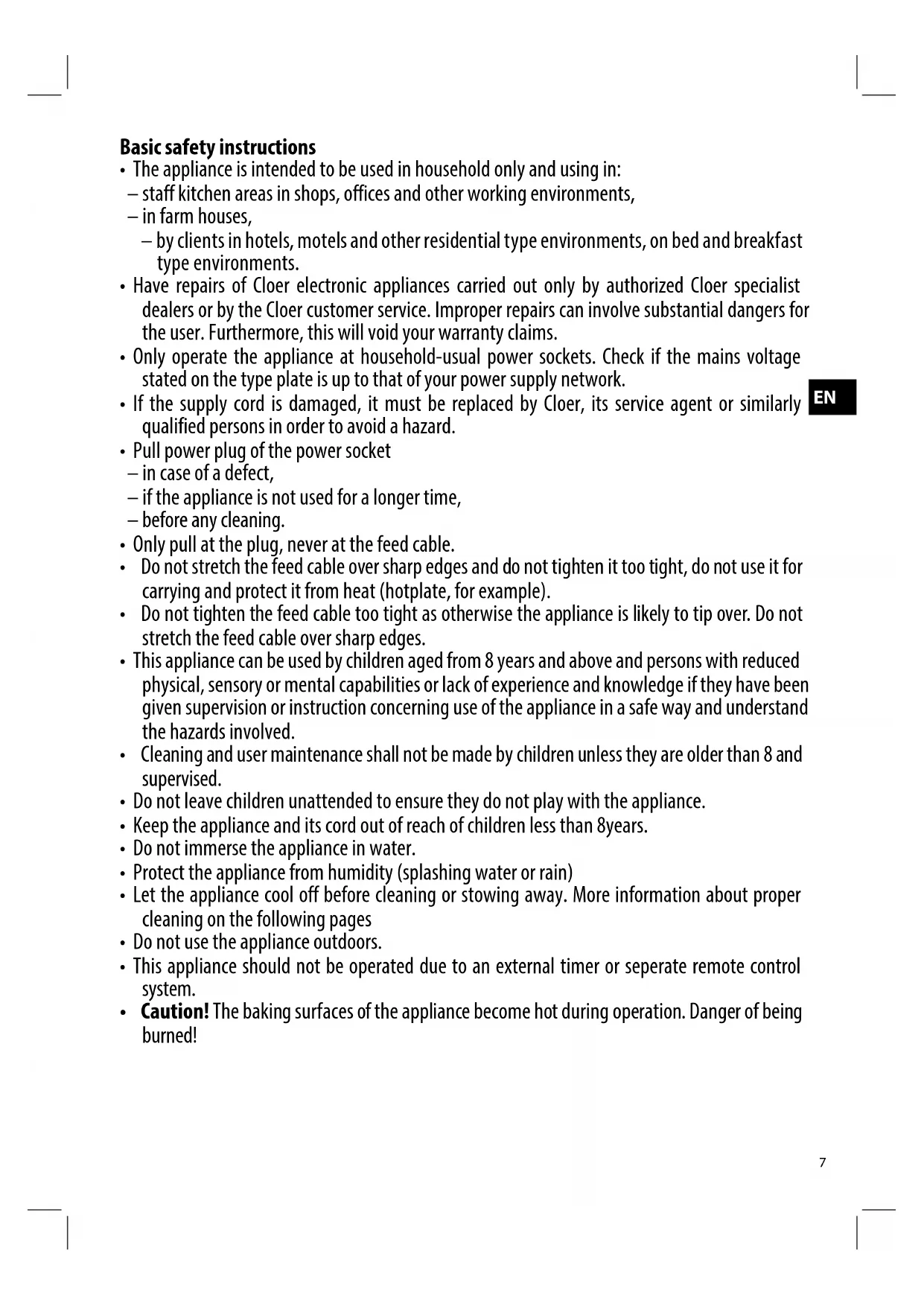 Cloer electrical appliances are in conformity with the currently required EC-guidelines and safety regulations. If your Cloer electrical appliance has a defect or it does not work properly, contact your specialist dealer.