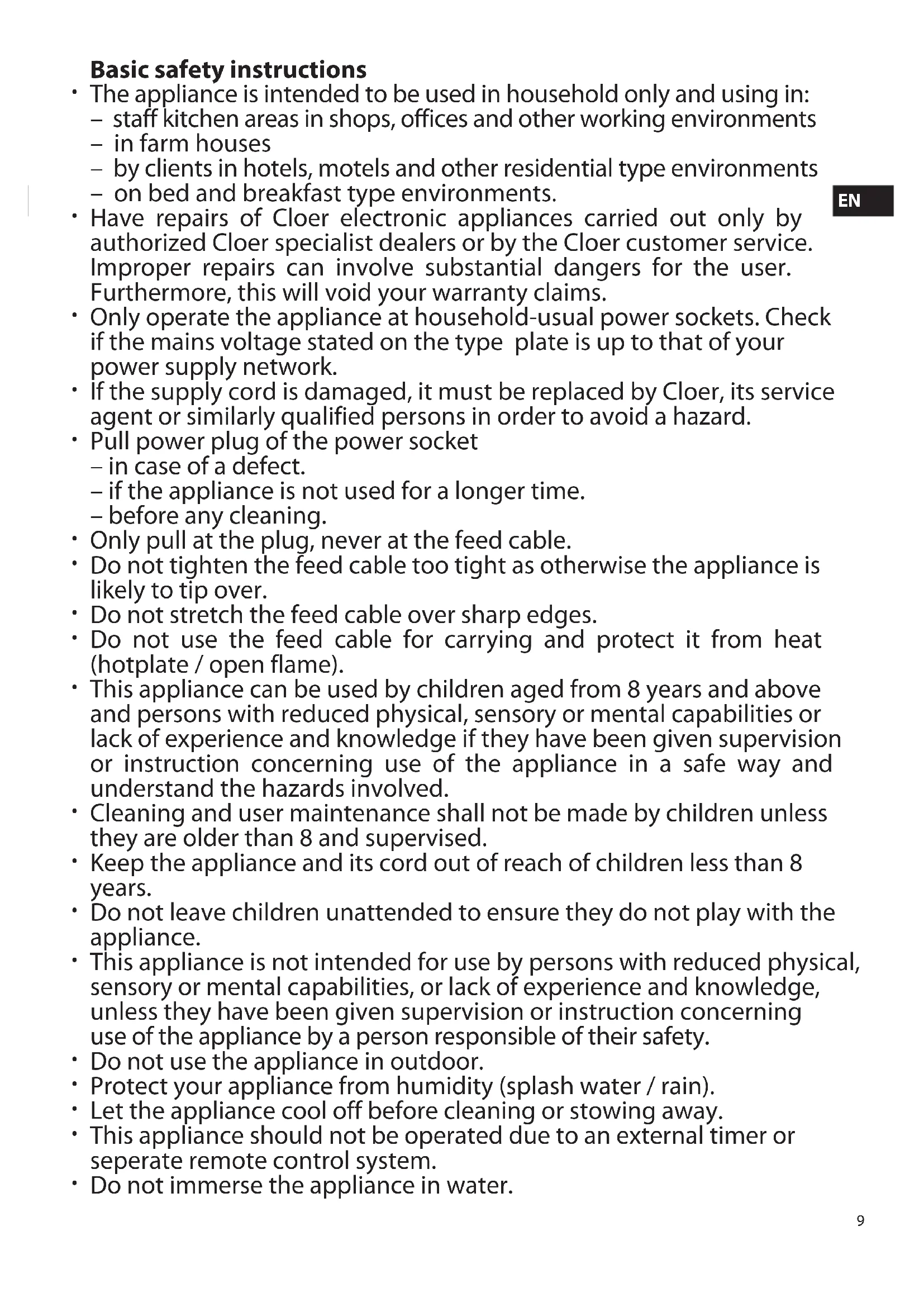 - Have repairs of Cloer electronic appliances carried out only by authorized Cloer specialist dealers or by the Cloer customer service. Improper repairs can involve substantial dangers for the user. Furthermore, this will void your warranty claims.