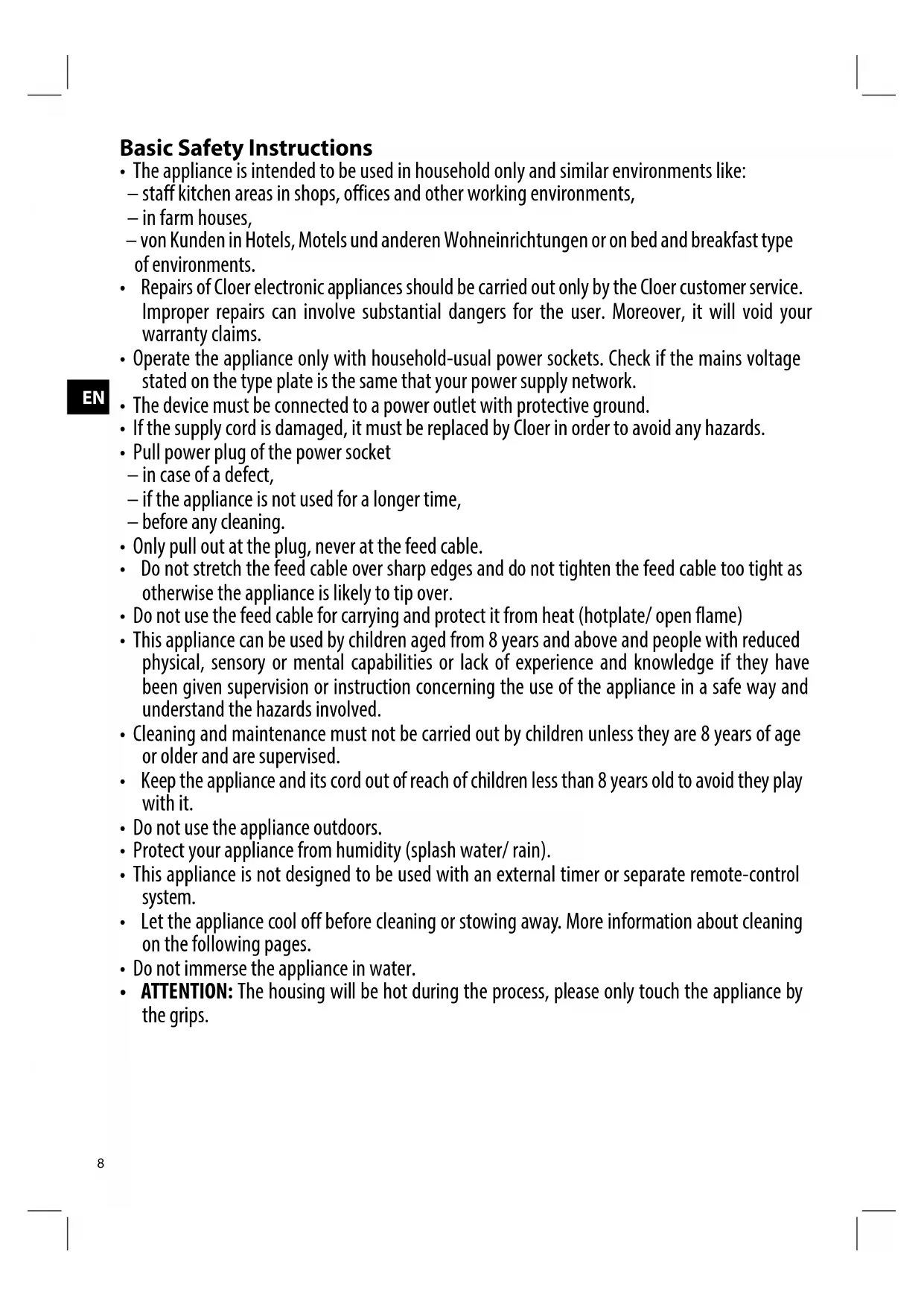 Cloer electrical appliances are in conformity with the currently required EC-guidelines and safety regulations. If your Cloer electrical appliance has a defect or it does not work properly, contact your specialist dealer. Registered clients have at their disposal our technical customer service.