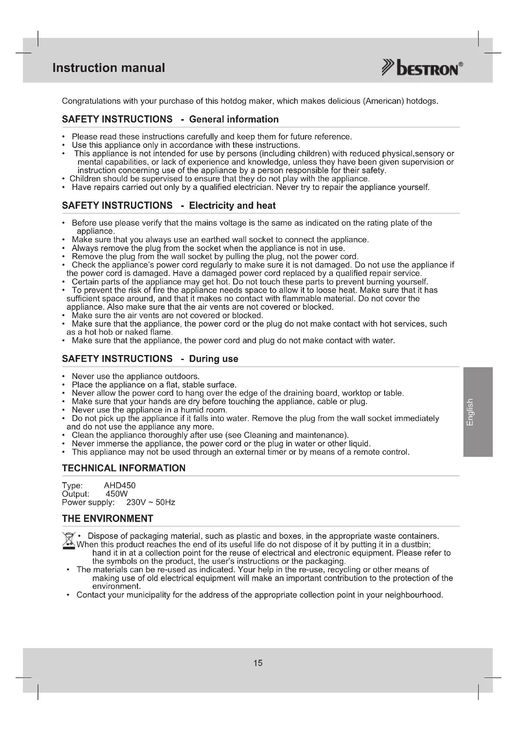 - This appliance may not be used through an external timer or by means of a remote control. TECHNICAL INFORMATION Type: AHD450 Output: 450W Power supply: 230V ~ 50Hz THE ENVIRONMENT