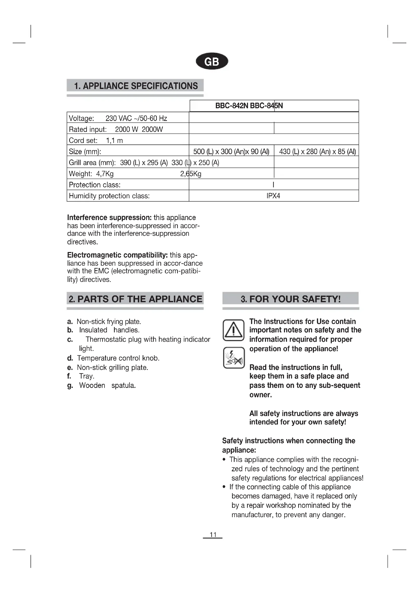 Interference suppression: this appliance has been interference-suppressed in accor- dance with the interference-suppression directives. Electromagnetic compatibility: this app- liance has been suppressed in accor-dance with the EMC (electromagnetic com-patibi- lity) directives. a. Non-stick frying plate. b. Insulated handles. c. Thermostatic plug with heating indicator light. d. Temperature control knob. e. Non-stick grilling plate. f. Tray. g. Wooden spatula.