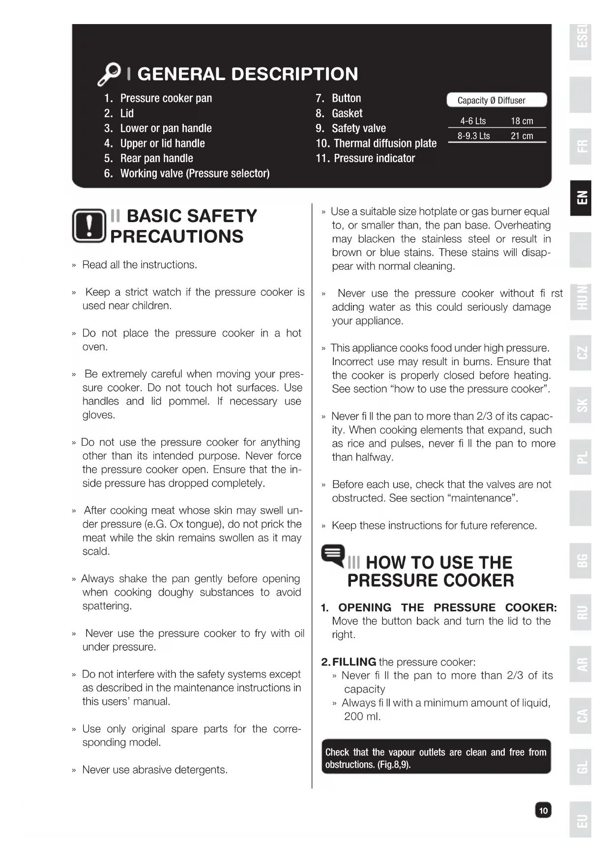 » Never fi ll the pan to more than 2/3 of its capacity » Always fi ll with a minimum amount of liquid, 200 ml. Check that the vapour outlets are clean and free from obstructions. (Fig.8,9). Capacity Ø Diffuser4-6 Lts8-9.3 Lts18 cm21 cm » Read all the instructions. » Keep a strict watch if the pressure cooker is used near children. » Do not place the pressure cooker in a hot oven. » Be extremely careful when moving your pres- sure cooker. Do not touch hot surfaces. Use handles and lid pommel. If necessary use gloves. » Do not use the pressure cooker for anything other than its intended purpose. Never force the pressure cooker open. Ensure that the in- side pressure has dropped completely. » After cooking meat whose skin may swell un- der pressure (e.G. Ox tongue), do not prick the meat while the skin remains swollen as it may scald. » Always shake the pan gently before opening when cooking doughy substances to avoid spattering. » Never use the pressure cooker to fry with oil under pressure. » Do not interfere with the safety systems except as described in the maintenance instructions in this users’ manual. » Use only original spare parts for the corre- sponding model. » Never use abrasive detergents.