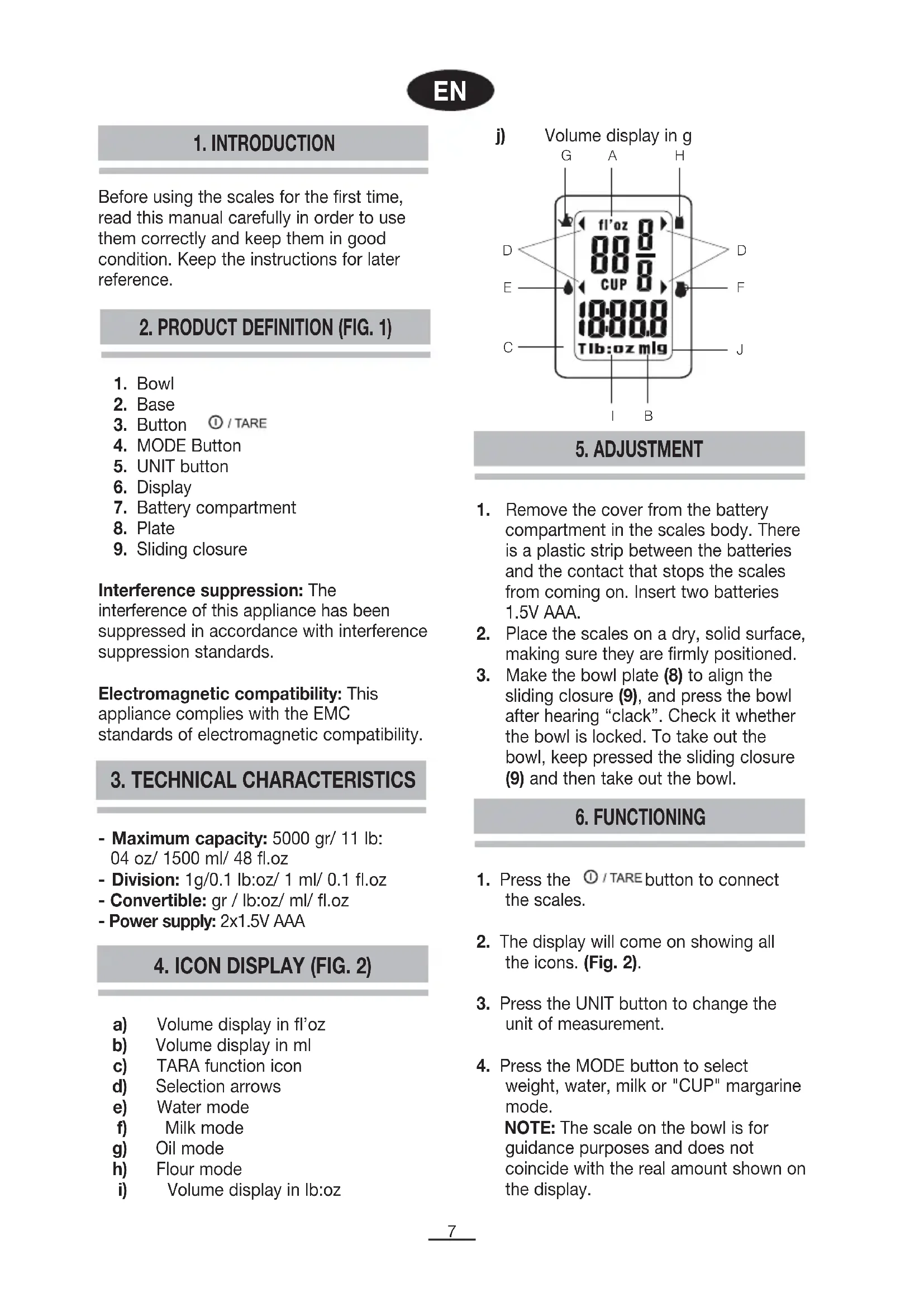 weight, water, milk or "CUP" margarine mode. NOTE: The scale on the bowl is for guidance purposes and does not coincide with the real amount shown on the display. j) Volume display in g