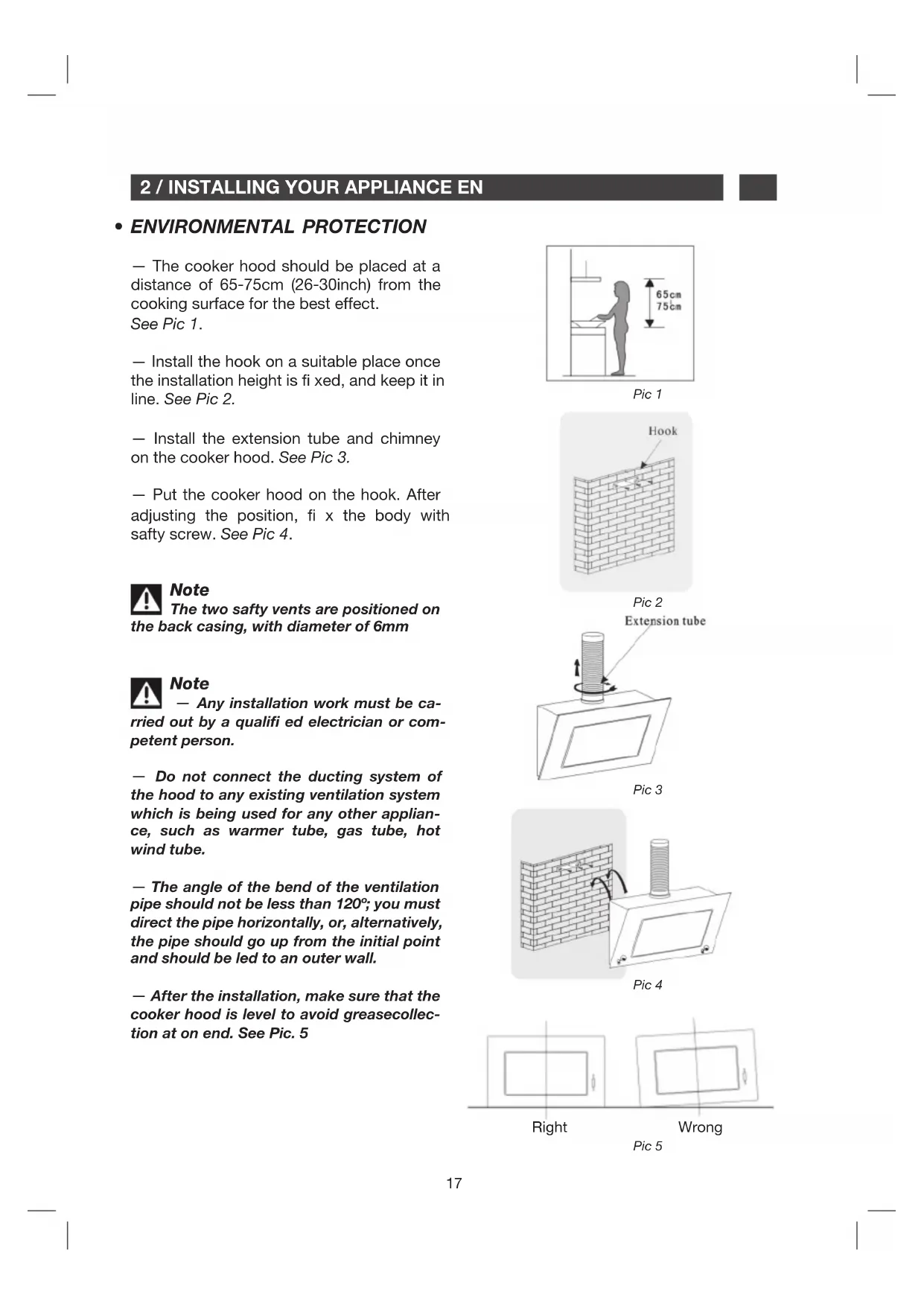 - ENVIRONMENTAL PROTECTION — The cooker hood should be placed at a distance of 65-75cm (26-30inch) from the cooking surface for the best effect. See Pic 1. — Install the hook on a suitable place once the installation height is xed, and keep it in line. See Pic 2. — Install the extension tube and chimney on the cooker hood. See Pic 3. — Put the cooker hood on the hook. After adjusting the position, x the body with safty screw. See Pic 4. Pic 1 Pic 2 Pic 3 Pic 4 Pic 5 Note The two safty vents are positioned on the back casing, with diameter of 6mm Note — Any installation work must be ca- rried out by a qualifi ed electrician or com- petent person. — Do not connect the ducting system of the hood to any existing ventilation system which is being used for any other applian- ce, such as warmer tube, gas tube, hot wind tube. — The angle of the bend of the ventilation pipe should not be less than 120º; you must direct the pipe horizontally, or, alternatively, the pipe should go up from the initial point and should be led to an outer wall. — After the installation, make sure that the cooker hood is level to avoid greasecollec- tion at on end. See Pic. 5 Right Wrong18
