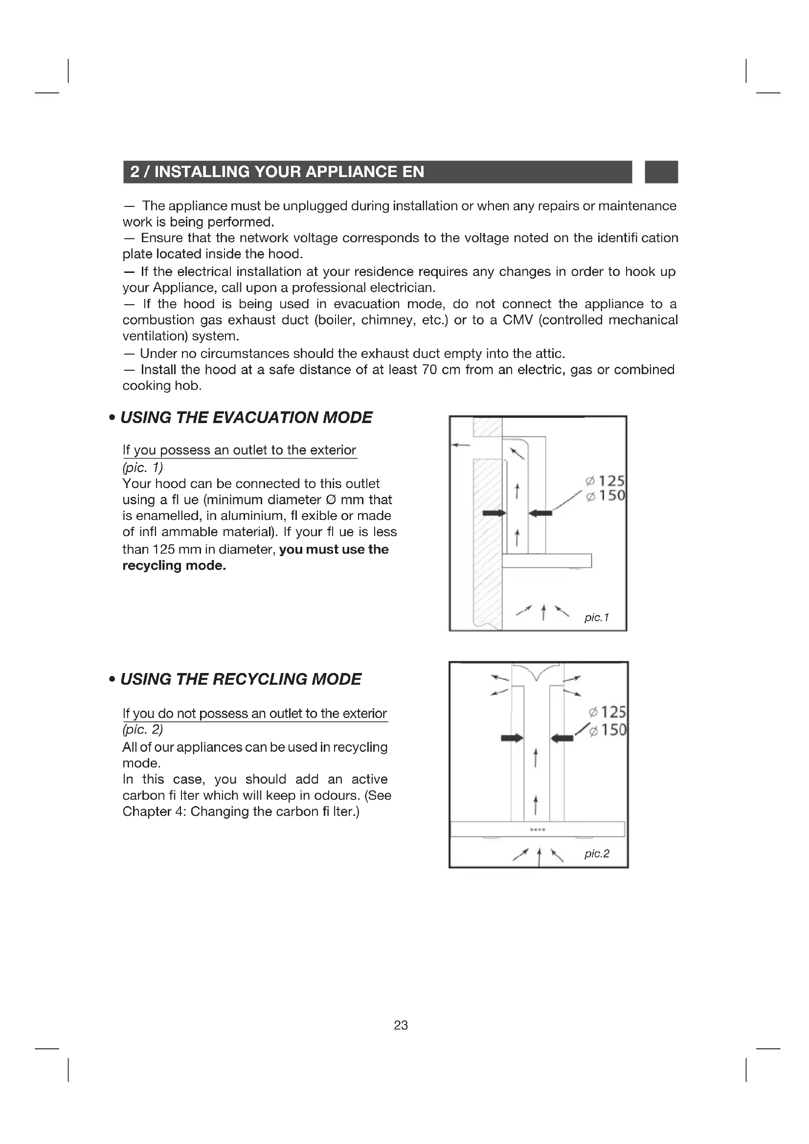 - USING THE RECYCLING MODE If you possess an outlet to the exterior (pic. 1) Your hood can be connected to this outlet using a ue (minimum diameter Ø mm that is enamelled, in aluminium, exible or made of in ammable material). If your ue is less than 125 mm in diameter, you must use the recycling mode. If you do not possess an outlet to the exterior (pic. 2) All of our appliances can be used in recycling mode. In this case, you should add an active carbon lter which will keep in odours. (See