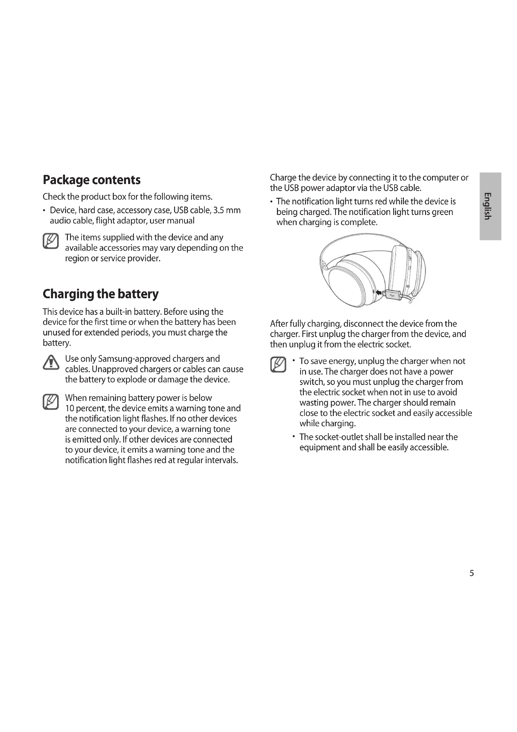 Device, hard case, accessory case, USB cable, 3.5 mm audio cable, flight adaptor, user manual The items supplied with the device and any available accessories may vary depending on the region or service provider. Charging the battery This device has a built-in battery. Before using the device for the first time or when the battery has been unused for extended periods, you must charge the battery. Use only Samsung-approved chargers and cables. Unapproved chargers or cables can cause the battery to explode or damage the device. When remaining battery power is below 10 percent, the device emits a warning tone and the notification light flashes. If no other devices are connected to your device, a warning tone is emitted only. If other devices are connected to your device, it emits a warning tone and the notification light flashes red at regular intervals.6 Turning the device on or off When you turn on the device for the first time, the device automatically enters the Bluetooth pairing mode for 3 minutes. Slide the Power switch up to turn on the device. ON OFF Slide the Power switch down to turn off the device. When the device is turned off, the notification light turns blue and then flashes red before turning off. Charging time and continuous run times Specifications for new Samsung-approved batteries (800 mAh) Charging time Approx. 2.5 hrs Continuous run times Call time Approx. 15 hrs Play time Approx. 15 hrs Standby time ANC ON: Approx. 25 hrs ANC OFF: Approx. 200 hrs