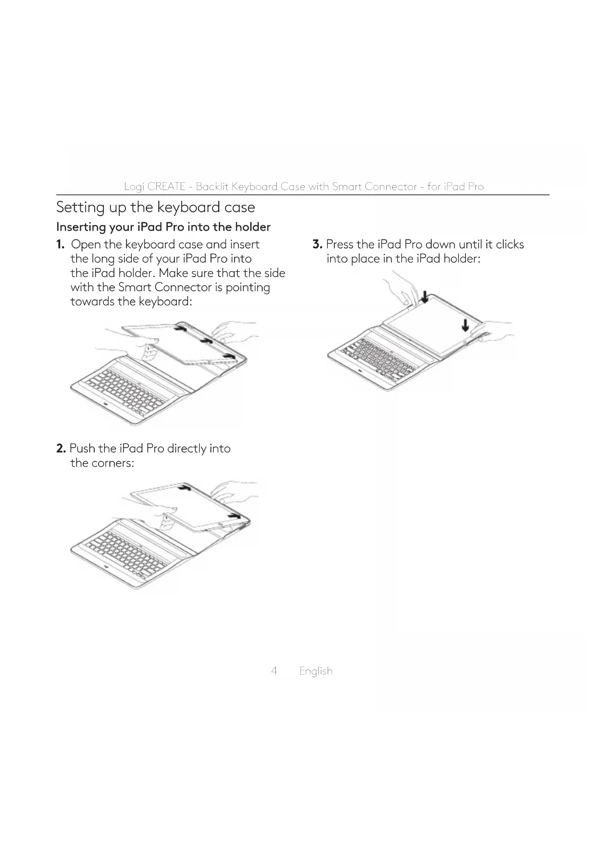 Logi CREATE - Backlit Keyboard Case with Smart Connector - for iPad Pro Setting up the keyboard case Inserting your iPadPro into the holder