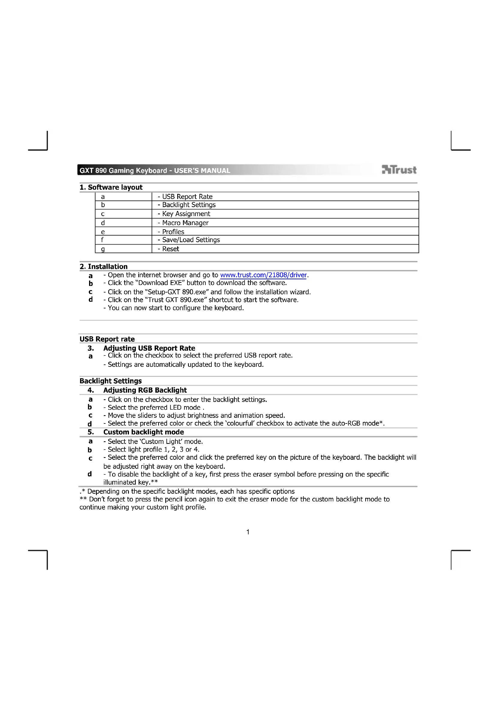 - Open the internet browser and go to www.trust.com/21808/driver. - Click the “Download EXE” button to download the software. - Click on the “Setup-GXT 890.exe” and follow the installation wizard. - Click on the “Trust GXT 890.exe” shortcut to start the software. - You can now start to configure the keyboard.