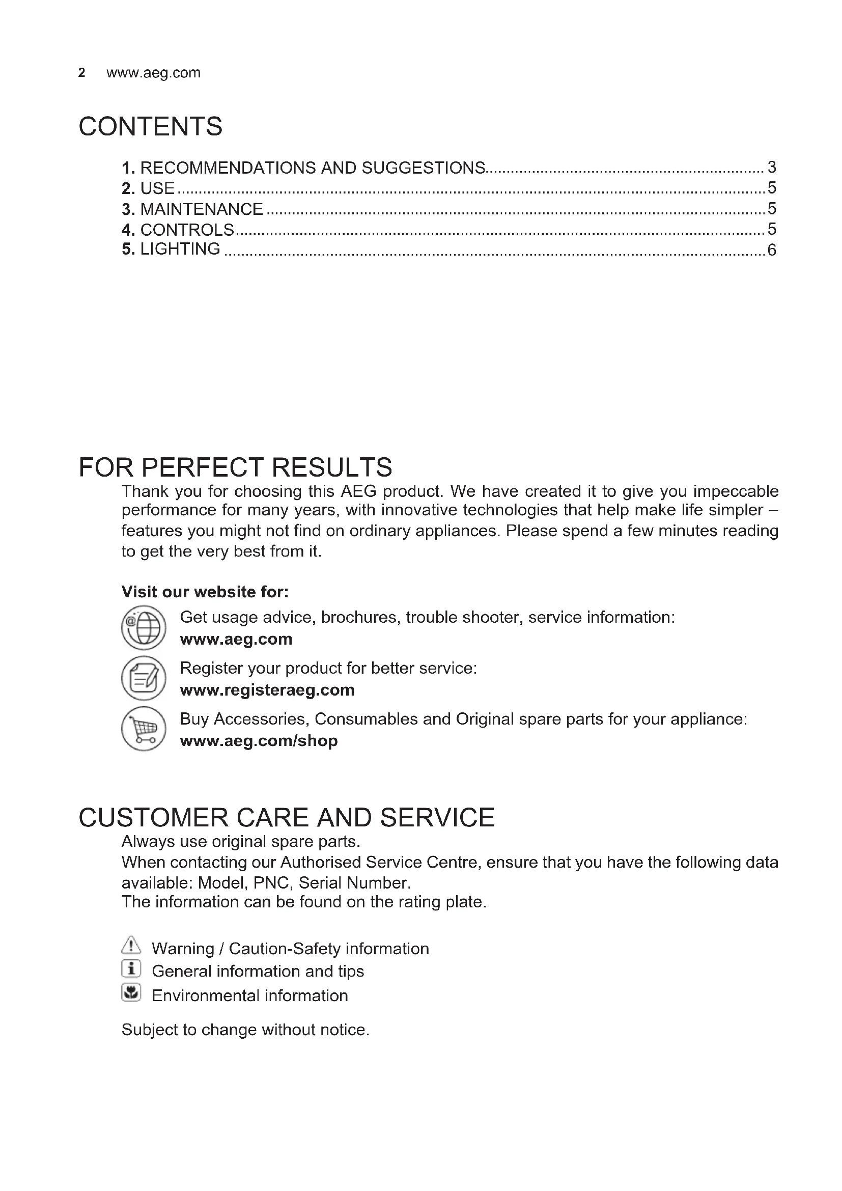 Thank you for choosing this AEG product. We have created it to give you impeccable performance for many years, with innovative technologies that help make life simpler – features you might not nd on ordinary appliances. Please spend a few minutes reading to get the very best from it. Visit our website for: Get usage advice, brochures, trouble shooter, service information: www.aeg.com Register your product for better service: www.registeraeg.com Buy Accessories, Consumables and Original spare parts for your appliance: www.aeg.com/shop