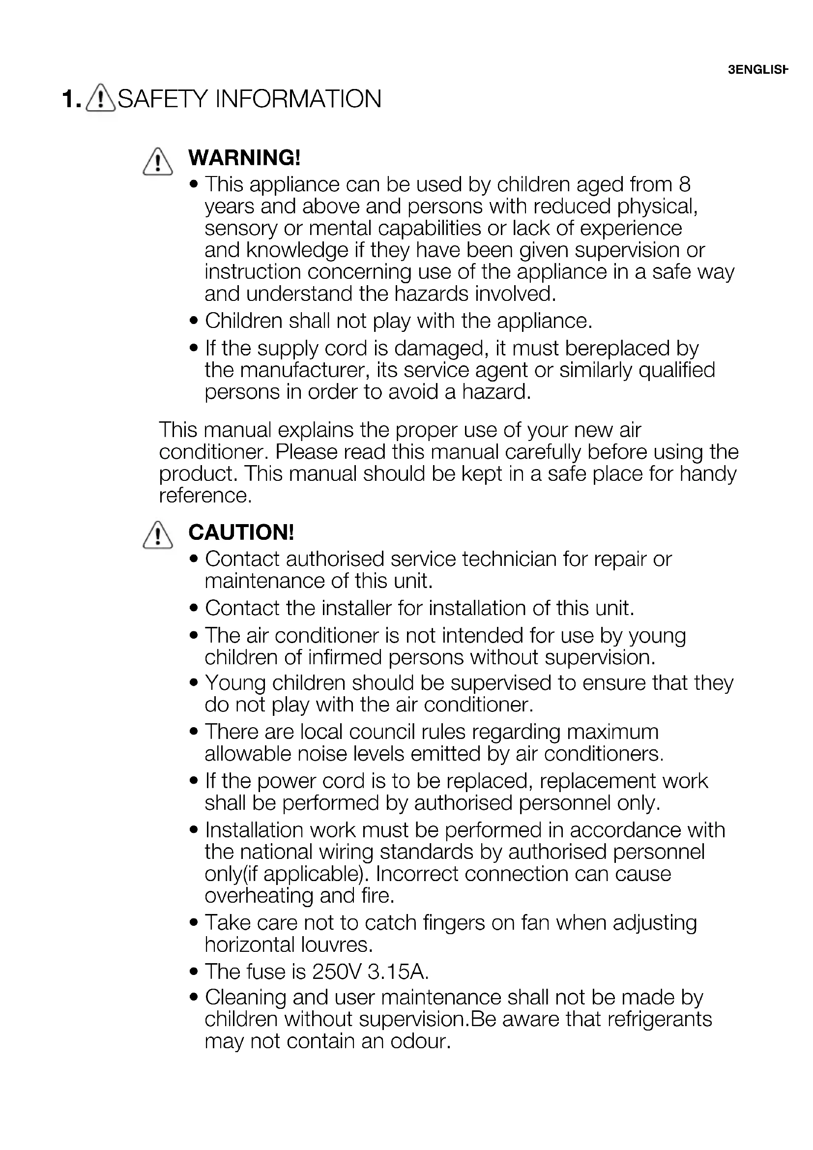 - Cleaning and user maintenance shall not be made by children without supervisionBe aware that refrigerants may not contain an odour This manual explains the proper use of your new air conditioner Please read this manual carefully before using the product This manual should be kept in a safe place for handy reference4 www.electrolux.com