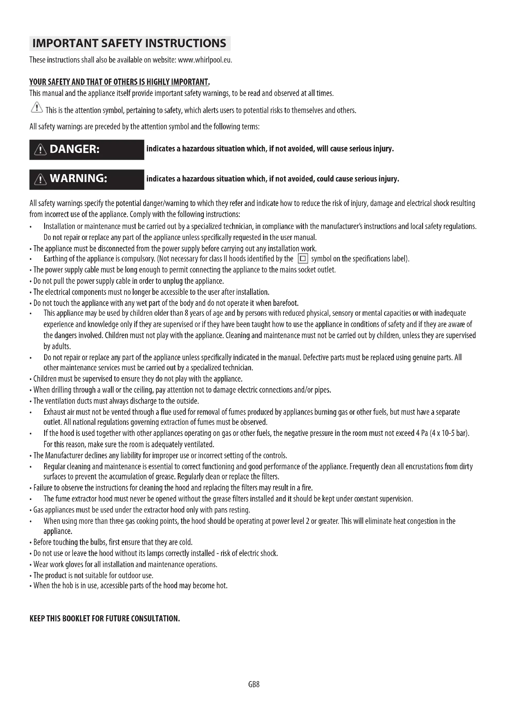 These instructions shall also be available on website: www.whirlpool.eu. YOUR SAFETY AND THAT OF OTHERS IS HIGHLY IMPORTANT. This manual and the appliance itself provide important safety warnings, to be read and observed at all times. This is the attention symbol, pertaining to safety, which alerts users to potential risks to themselves and others. All safety warnings are preceded by the attention symbol and the following terms: indicates a hazardous situation which, if not avoided, will cause serious injury. indicates a hazardous situation which, if not avoided, could cause serious injury. All safety warnings specify the potential danger/warning to which they refer and indicate how to reduce the risk of injury, damage and electrical shock resulting from incorrect use of the appliance. Comply with the following instructions: