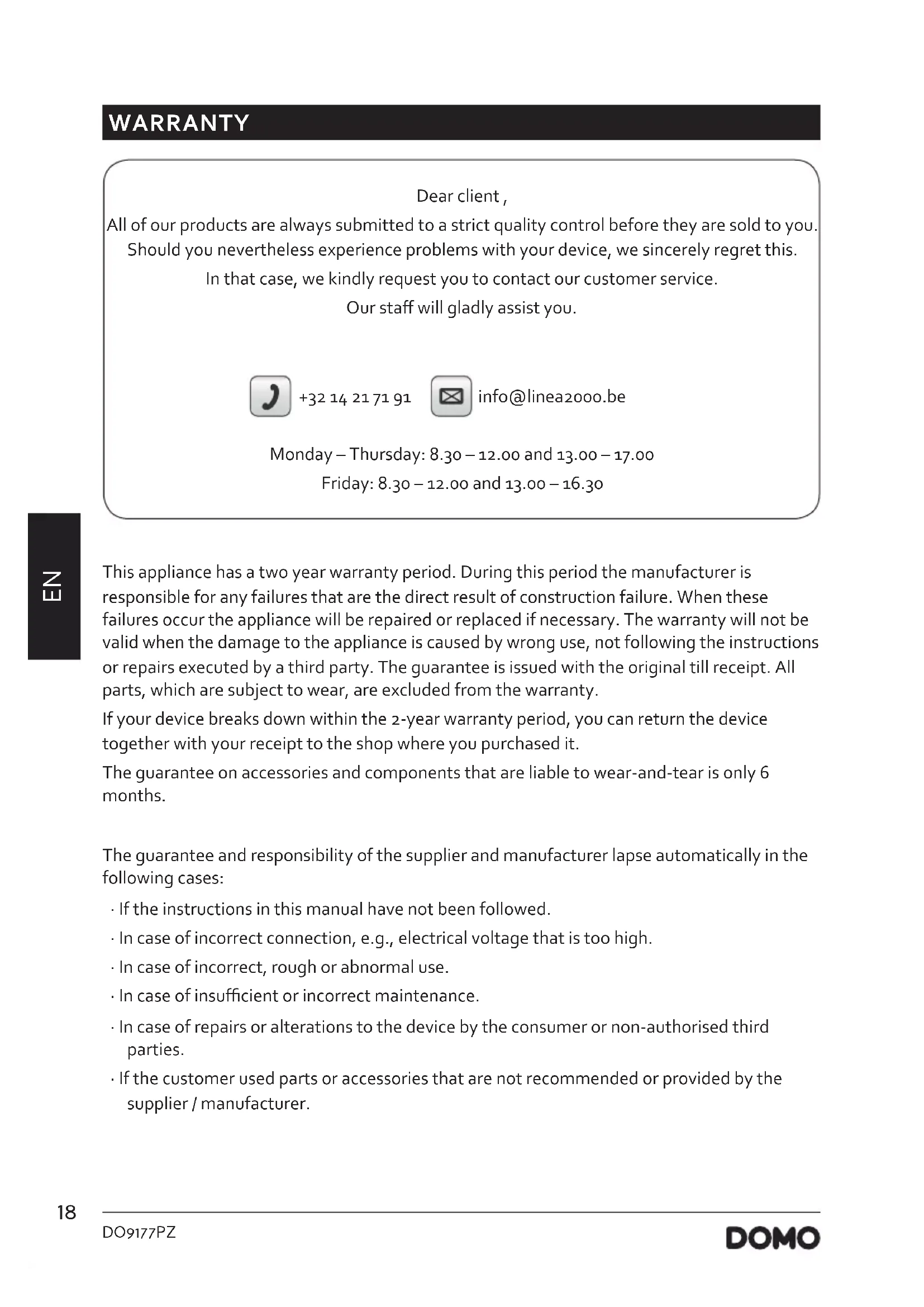 WARRANTY Dear client , All of our products are always submitted to a strict quality control before they are sold to you. Should you nevertheless experience problems with your device, we sincerely regret this. In that case, we kindly request you to contact our customer service. Our sta will gladly assist you. +32 14 21 71 91 info@linea2000.be Monday – Thursday: 8.30 – 12.00 and 13.00 – 17.00 Friday: 8.30 – 12.00 and 13.00 – 16.30 This appliance has a two year warranty period. During this period the manufacturer is responsible for any failures that are the direct result of construction failure. When these failures occur the appliance will be repaired or replaced if necessary. The warranty will not be valid when the damage to the appliance is caused by wrong use, not following the instructions or repairs executed by a third party. The guarantee is issued with the original till receipt. All parts, which are subject to wear, are excluded from the warranty. If your device breaks down within the 2-year warranty period, you can return the device together with your receipt to the shop where you purchased it. The guarantee on accessories and components that are liable to wear-and-tear is only 6 months. The guarantee and responsibility of the supplier and manufacturer lapse automatically in the following cases: