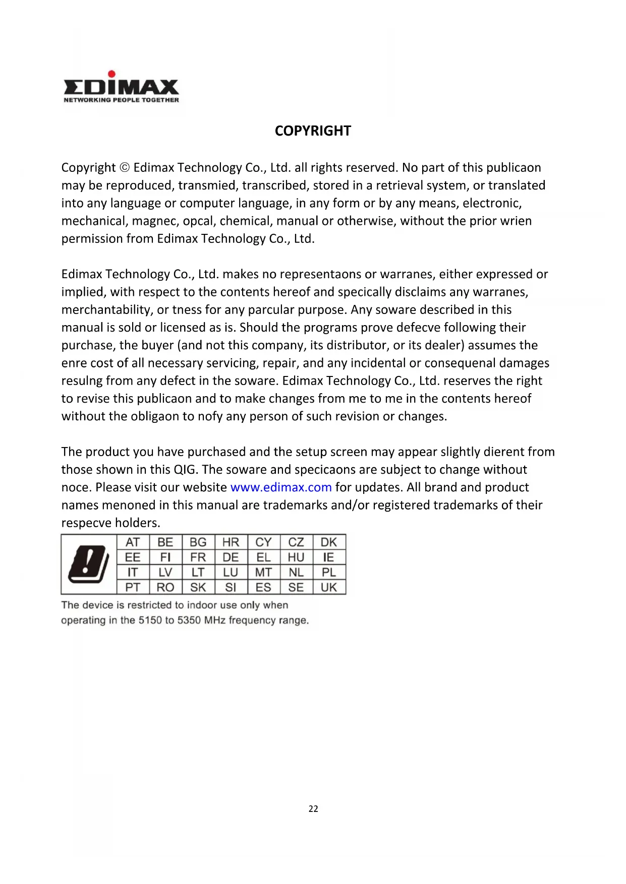 COPYRIGHT Copyright Edimax Technology Co., Ltd. all rights reserved. No part of this publication may be reproduced, transmitted, transcribed, stored in a retrieval system, or translated into any language or computer language, in any form or by any means, electronic, mechanical, magnetic, optical, chemical, manual or otherwise, without the prior written permission from Edimax Technology Co., Ltd. Edimax Technology Co., Ltd. makes no representations or warranties, either expressed or implied, with respect to the contents hereof and specifically disclaims any warranties, merchantability, or fitness for any particular purpose. Any software described in this manual is sold or licensed as is. Should the programs prove defective following their purchase, the buyer (and not this company, its distributor, or its dealer) assumes the entire cost of all necessary servicing, repair, and any incidental or consequential damages resulting from any defect in the software. Edimax Technology Co., Ltd. reserves the right to revise this publication and to make changes from time to time in the contents hereof without the obligation to notify any person of such revision or changes. The product you have purchased and the setup screen may appear slightly different from those shown in this QIG. The software and specifications are subject to change without notice. Please visit our website www.edimax.com for updates. All brand and product names mentioned in this manual are trademarks and/or registered trademarks of their respective holders.23 Federal Communication Commission Interference Statement This equipment has been tested and found to comply with the limits for a Class B digital device, pursuant to Part 15 of FCC Rules. These limits are designed to provide reasonable protection against harmful interference in a residential installation. This equipment generates, uses, and can radiate radio frequency energy and, if not installed and used in accordance with the instructions, may cause harmful interference to radio communications. However, there is no guarantee that interference will not occur in a particular installation. If this equipment does cause harmful interference to radio or television reception, which can be determined by turning the equipment off and on, the user is encouraged to try to correct the interference by one or more of the following measures: