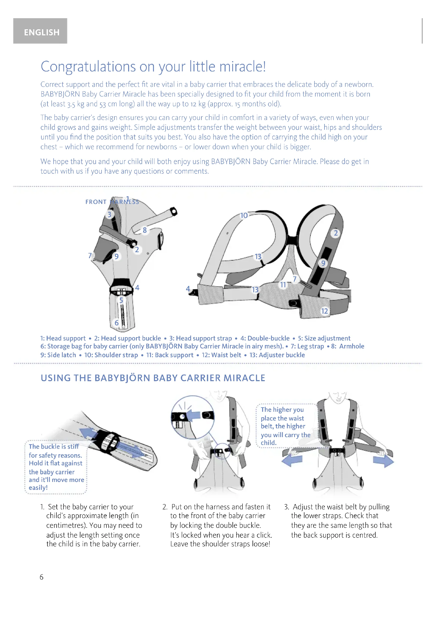 . Put on the harness and fasten it to the front of the baby carrier by locking the double buckle. It’s locked when you hear a click. Leave the shoulder straps loose! The buckle is sti for safety reasons. Hold it flat against the baby carrier and it’ll move more easily! The higher you place the waist belt, the higher you will carry the child. . Adjust the waist belt by pulling the lower straps. Check that they are the same length so that the back support is centred. : Head support • : Head support buckle • : Head support strap • : Double-buckle • : Size adjustment : Storage bag for baby carrier (only BABYBJÖRN Baby Carrier Miracle in airy mesh). • : Leg strap • 8: Armhole : Side latch • : Shoulder strap • : Back support • : Waist belt • : Adjuster buckle . Set the baby carrier to your child’s approximate length (in centimetres). You may need to adjust the length setting once the child is in the baby carrier. Congratulations on your little miracle! Correct support and the perfect fit are vital in a baby carrier that embraces the delicate body of a newborn. BABYBJÖRN Baby Carrier Miracle has been specially designed to fit your child from the moment it is born (at least 3.5 kg and 53 cm long) all the way up to 12 kg (approx. 15 months old). The baby carrier’s design ensures you can carry your child in comfort in a variety of ways, even when your child grows and gains weight. Simple adjustments transfer the weight between your waist, hips and shoulders until you find the position that suits you best. You also have the option of carrying the child high on your chest – which we recommend for newborns – or lower down when your child is bigger. We hope that you and your child will both enjoy using BABYBJÖRN Baby Carrier Miracle. Please do get in touch with us if you have any questions or comments. USING THE BABYBJÖRN BABY CARRIER MIRACLE ENGLISH Position the back support lower down to get more support on your hips and lower back. For secure closeness and control of your child, carry your newborn facing you high up on your chest. Once a bit bigger, your child can be carried lower down to relieve pressure on your shoulders. From approx. 4 months old (or when their neck is strong enough) you can also switch between carrying your child facing you or forwards. . Adjust the shoulder straps. The more you tighten them, the more weight you will take on your shoulders. To reduce the load on your shoulders, simply lift the outer edges of the adjuster buckles. . Adjust the back support to a comfortable position. . You can adjust the head support by carefully pulling on the head support straps. Make sure that there is enough air space around your child’s head. . Fasten the head support on both sides. Place your thumb behind the knob on the harness. Click into place! . Fasten the latch on one side by inserting the hook into the slot. Check that it is firmly locked. . Place the child in the baby carrier, facing you. Each leg should be on its respective side of the baby carrier front and the child’s arms should be placed through the armholes. . Fasten the latch on the other side by inserting the hook into the slot. For smaller children weighing between 3.5 and 4.5 kg (8–11 lbs), fasten the leg straps on both sides as well.
