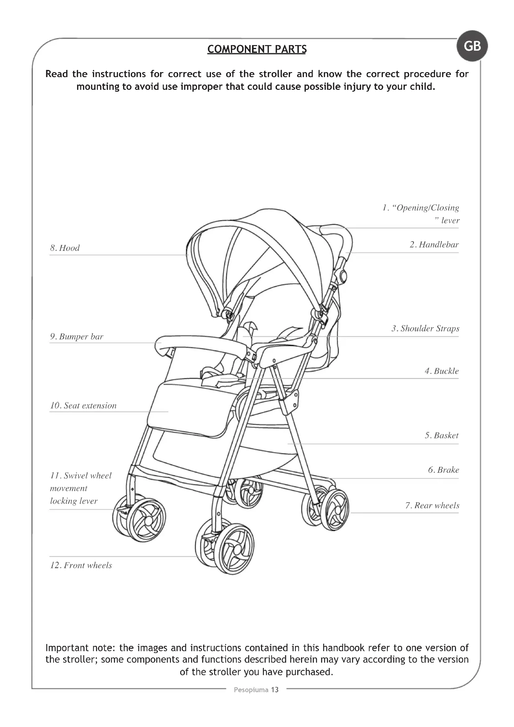 A basket is provided for the carriage of 2 kg of goods, evenly distributed. The product must be assembled by an adult. Only the minder can operate the recline adjuster. Never use the stroller if any part of it is damaged or any component is missing. Do not allow children to play with or hang onto the stroller. This vehicle requires regular maintenance by the user. Do not use replacement parts or accessories other than those approved by the supplier as they may render the pushchair unsafe.GB Pesopiuma 17 WARNING Overloading, incorrect folding, and the use of non-approved accessories or spare parts may damage or break this pushchair and could render the product unsafe. Read the instructions. Do not overload this pushchair with additional children, goods or accessories. Bags and other items must not be hung from the handle. Never leave rain covers on indoors, in a hot atmosphere or near a heat source as the baby could overheat. Ensure all users are familiar with the products operation. It should always open and fold easy. If it does not, do not force the mechanism - stop and read the instructions. Do not use your pushchair in a manner for which it is not designed. Do not allow your child to climb unassisted into, play with or hang onto your pushchair. Hold on to your pushchair when close to moving road vehicles or trains. Even with the brake on the draught from the vehicle may move the pushchair. Exercise caution when mounting or dismounting a kerb. Remove your children and fold the pushchair when ascending or descending stairs or escalators. Ensure the folded pushchair is stored away from children so that it does not fall and cause injury. Do not use replacement parts or accessories, e.g. child seats, bags, hooks, trays, rain covers etc. other than those approved by the supplier, they may render the pushchair unsafe. Never carry a third child on your pushchair. Do not use any platforms or attachments that allow transportation of third child. CARE Your pushchair has been designed to meet safety standards and with correct use and maintenance will give many years of trouble free performance. The chassis is strong but will weaken should the back wheels be bumped down stairs or kerbs. continual impact will cause damage. If your child wears hard shoes these might damage the soft fabric. Storing a damp pushchair will encourage mildew to form. After exposure to damp conditions, dry off with a soft cloth, open fully and allow to dry thoroughly before storing. Store your pushchair in a dry, safe place. Do not leave the pushchair in sunlight for prolonged periods - some fabrics may fade.GB Pesopiuma 18 MAINTENANCE This pushchair requires regular maintenance by the user. This product is designed to operate with minimum maintenance, however regular lubrication of moving parts will extend the life of your pushchair and make opening and folding easier. Should parts of your pushchair become stiff or difcult to operate, apply a light application of a spray lubricant e.g. WD 40. Do not use oil or grease. WD 40 should not be used to lubricate the running of removable wheels. If necessary, these should be removed and cleaned with a soft dry cloth. Regularly inspect the locking devices, brakes, wheels, harness assembly, catches, seat adjusters, joints and xings to ensure they are secure and in full working order. Brakes, wheels and tyres are subject to wear and should be replaced if necessary. Your pushchair should be serviced and reconditioned before using it for a second baby, or within 18 months, whichever is the sooner. CLEANING The fabric may be cleaned by sponging lightly using warm water and a mild detergent. Plastic and metal parts may be sponged clean with warm water and a mild detergent. Never clean with abrasive, ammonia based, bleach based or spirit type cleaners.GB Pesopiuma 19 The contents of this document as stated below will come into effect as from