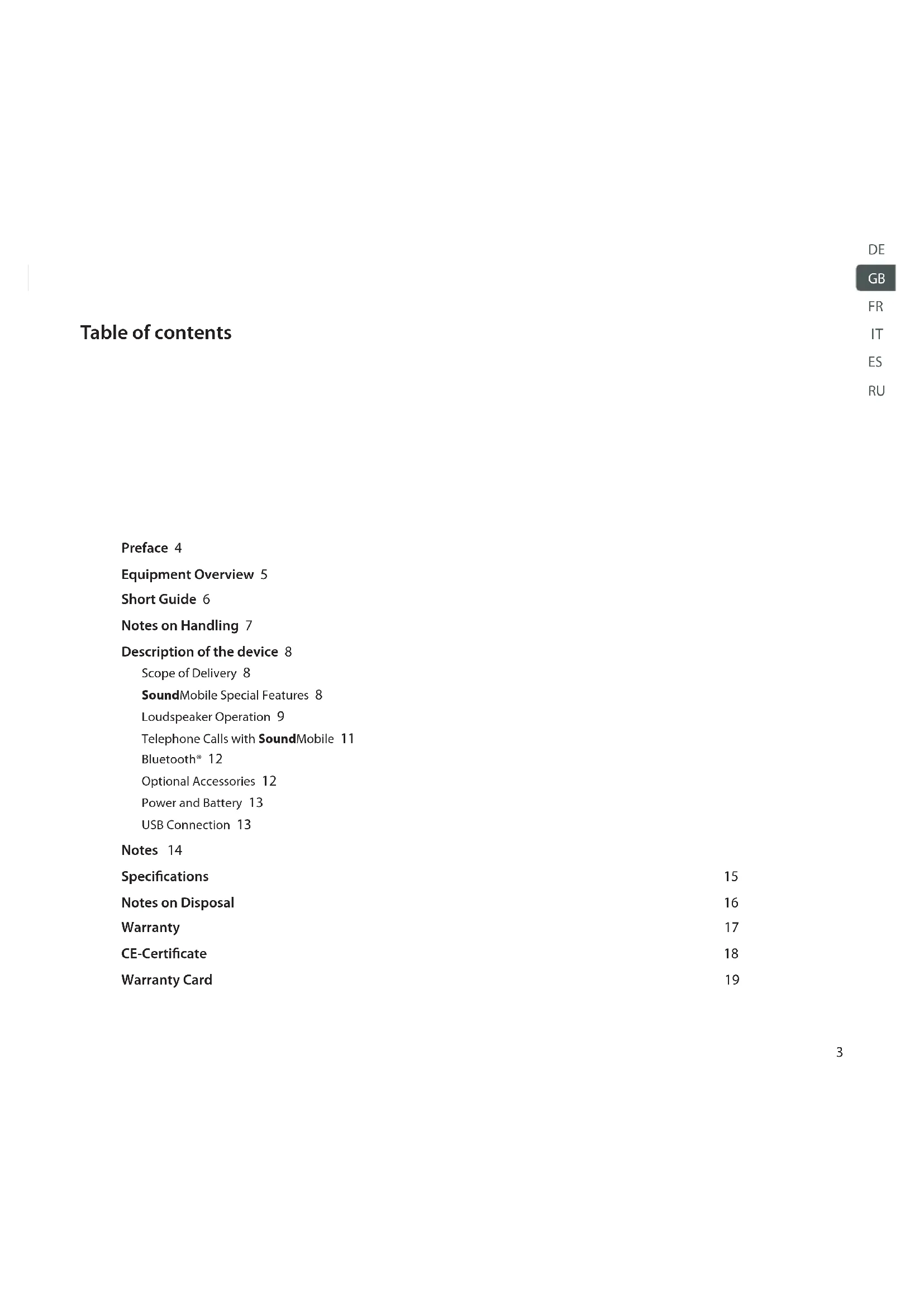 water resistant3 Preface 4 Equipment Overview 5 Short Guide 6 Notes on Handling 7 Description of the device 8 Scope of Delivery 8 SoundMobile Special Features 8 Loudspeaker Operation 9 Telephone Calls with SoundMobile 11 Bluetooth® 12 Optional Accessories 12 Power and Battery 13 USB Connection 13 Notes 14 Specications 15 Notes on Disposal 16 Warranty 17 CE-Certicate 18 Warranty Card 19 Table of contents