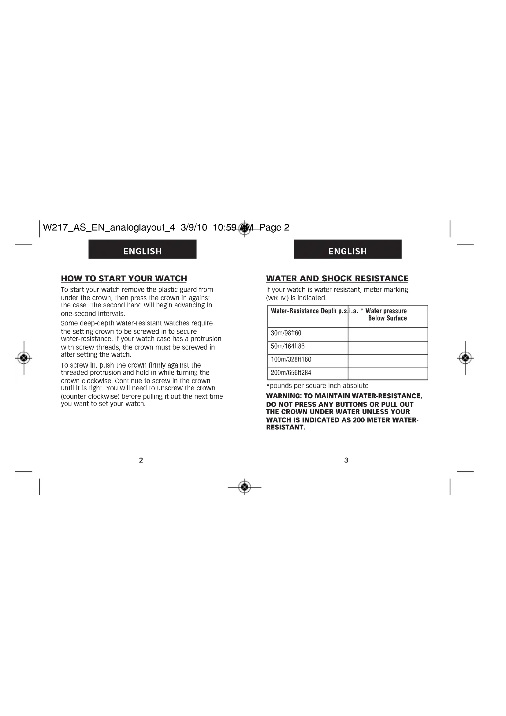 watch. Please read these instructions carefully to understand how to operate your Timex timepiece. Your watch may not have all of the features described in this booklet. For more information, please visit: www.timex.com W217_AS_EN_analoglayout_4 3/9/10 10:59 AM Page ENiTABLE OF CONTENTS 2 How to Start Your Watch 3 Water and Shock Resistance 4 Indiglo