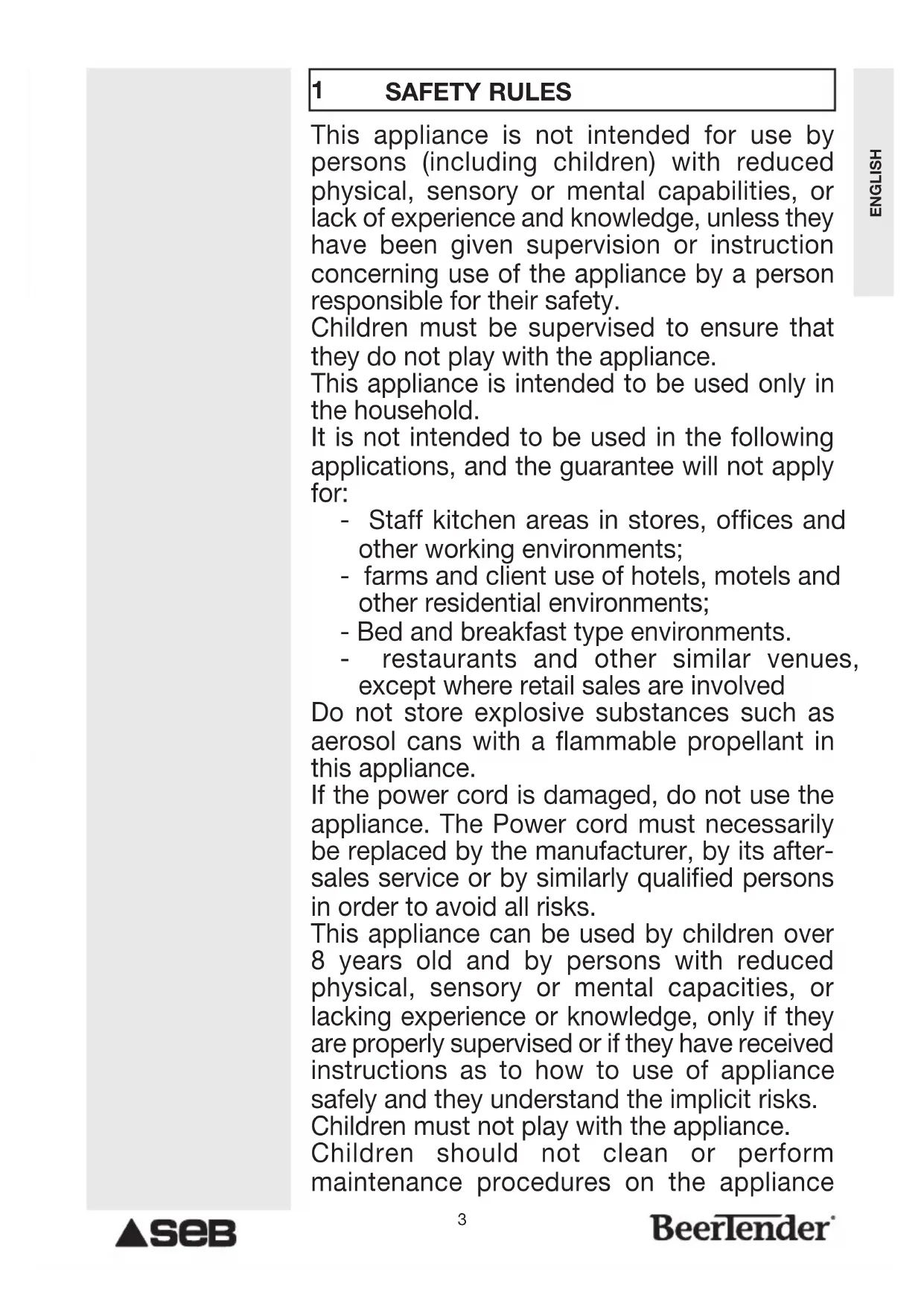 SAFETY RULES This appliance is not intended for use by persons (including children) with reduced physical, sensory or mental capabilities, or lack of experience and knowledge, unless they have been given supervision or instruction concerning use of the appliance by a person responsible for their safety. Children must be supervised to ensure that they do not play with the appliance. This appliance is intended to be used only in the household. It is not intended to be used in the following applications, and the guarantee will not apply for: - Staff kitchen areas in stores, offices and other working environments; - farms and client use of hotels, motels and other residential environments; - Bed and breakfast type environments. - restaurants and other similar venues, except where retail sales are involved Do not store explosive substances such as aerosol cans with a flammable propellant in this appliance. If the power cord is damaged, do not use the appliance. The Power cord must necessarily be replaced by the manufacturer, by its after- sales service or by similarly qualified persons in order to avoid all risks. This appliance can be used by children over 8 years old and by persons with reduced physical, sensory or mental capacities, or lacking experience or knowledge, only if they are properly supervised or if they have received instructions as to how to use of appliance safely and they understand the implicit risks. Children must not play with the appliance. Children should not clean or perform maintenance procedures on the appliance4 ENGLISH unless they are supervised by a responsible adult. Only connect the machine to a mains voltage supply that coincides with the voltage indicated on the sign plate of your appliance. The connection to an incorrect supply voltage will invalidate the guarantee and could be dangerous. In case of inappropriate use or failure to follow the instructions, the manufacturer guarantee is declared void. Use only “Beer Tender Compatible” barrels. Always use the machine on a flat, stable, heat-resistant surface which is protected from other heat sources or water splashes. In order to protect people against fire, electric shocks and wounds, avoid immersing the power cord or plug in water or any other liquid. Never unplug the appliance with wet hands. In case of an emergency, unplug the the appliance immediately. Do not use the appliance without its draining tray and grill. After use, empty and clean the draining tray every day. Unplug the machine from the mains whenever you are not using it. Unplug the machine from the mains before cleaning. Never clean the machine with running water and do not immerse it in any liquid. Never use detergents to clean the machine. Clean the machine using only soft sponges and brushes. In case of a prolonged period without use (vacations, storage, etc.), unplug, empty and clean the machine. Any functioning, cleaning or maintenance which is outside the limits of normal use should be reserved to the staff at the local authorized service centres. Do not disassemble the appliance or place any objects in any of its openings. The use of accessories not recommended by the manufacturer could cause fires, electric shocks or wounds. Do not let the power cord hang from the edge of a table or work top, nor come into contact with hot surfaces or sharp edges. Do not let the electric cord hang (to avoid the risk of stumbling). Never touch the cord with wet hands. Do not place the machine on a gas or electric stove, nor near such heat sources, nor inside a hot oven. Before unplugging the appliance, make sure the ON/OFF button is set to OFF, then remove the plug from the outlet. Do not unplug the machine by pulling on the cord. In case you need to use the machine with an extension cord, respect the corresponding load recommendations for the extention. If the wall outlet does not correspond to the machine plug, have the plug replaced by the after-sales service or by similarly qualified persons in order to avoid all risks. The wrapping is made up of recyclable materials. Contact the local authorities for more information on recycling programs. Your machine contains materials that can be recovered or recycled. IMPORTANT: Always leave the beer engine on if you have a barrel inside the machine.1 - Safety rules 3