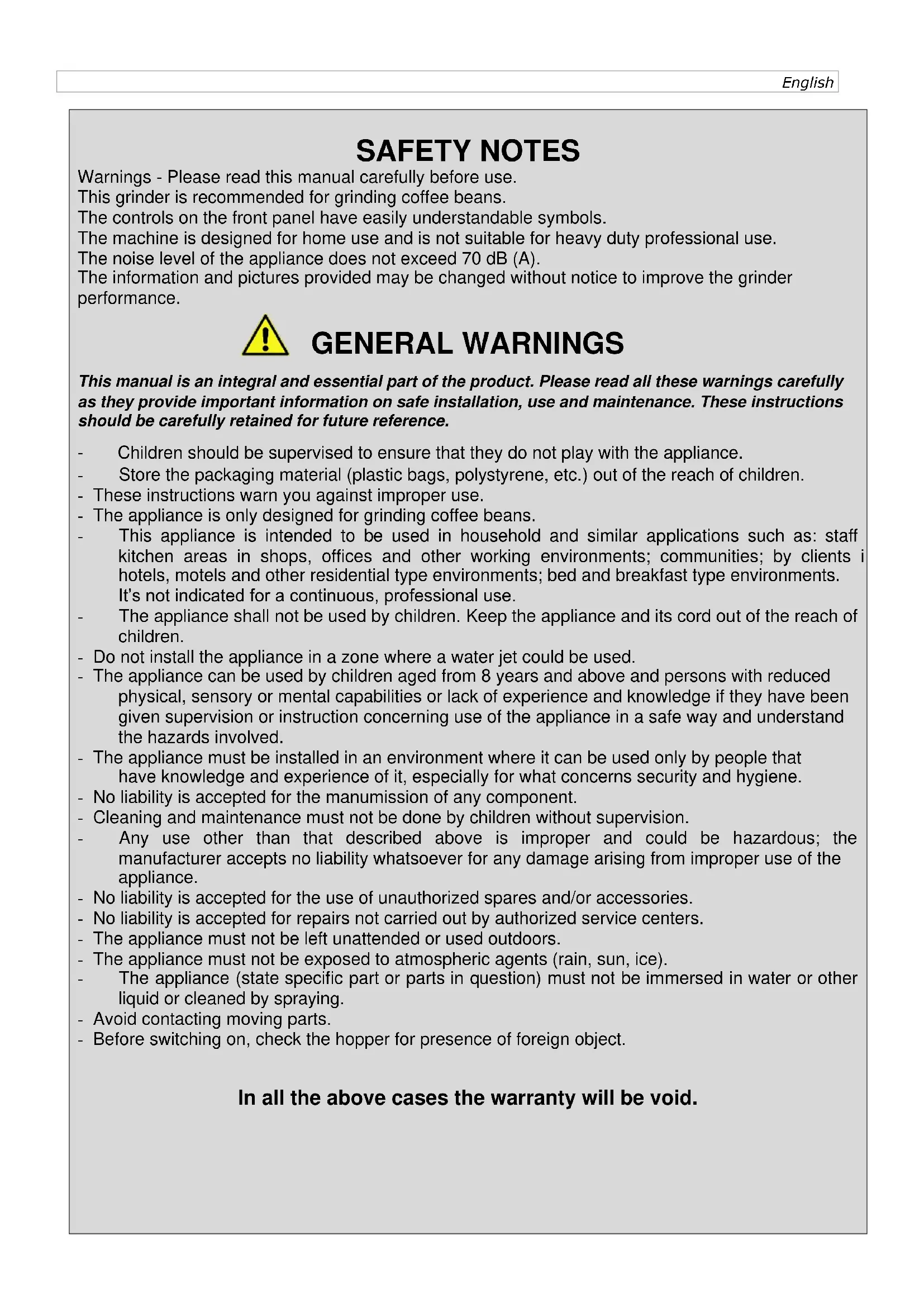 SAFETY NOTES Warnings - Please read this manual carefully before use. This grinder is recommended for grinding coffee beans. The controls on the front panel have easily understandable symbols. The machine is designed for home use and is not suitable for heavy duty professional use. The noise level of the appliance does not exceed 70 dB (A). The information and pictures provided may be changed without notice to improve the grinder performance. GENERAL WARNINGS This manual is an integral and essential part of the product. Please read all these warnings carefully as they provide important information on safe installation, use and maintenance. These instructions should be carefully retained for future reference. - Children should be supervised to ensure that they do not play with the appliance. - Store the packaging material (plastic bags, polystyrene, etc.) out of the reach of children. - These instructions warn you against improper use. - The appliance is only designed for grinding coffee beans. - This appliance is intended to be used in household and similar applications such as: staff kitchen areas in shops, offices and other working environments; communities; by clients in hotels, motels and other residential type environments; bed and breakfast type environments. It’s not indicated for a continuous, professional use. - The appliance shall not be used by children. Keep the appliance and its cord out of the reach of children. - Do not install the appliance in a zone where a water jet could be used. - The appliance can be used by children aged from 8 years and above and persons with reduced physical, sensory or mental capabilities or lack of experience and knowledge if they have been given supervision or instruction concerning use of the appliance in a safe way and understand the hazards involved. - The appliance must be installed in an environment where it can be used only by people that have knowledge and experience of it, especially for what concerns security and hygiene. - No liability is accepted for the manumission of any component. - Cleaning and maintenance must not be done by children without supervision. - Any use other than that described above is improper and could be hazardous; the manufacturer accepts no liability whatsoever for any damage arising from improper use of the appliance. - No liability is accepted for the use of unauthorized spares and/or accessories. - No liability is accepted for repairs not carried out by authorized service centers. - The appliance must not be left unattended or used outdoors. - The appliance must not be exposed to atmospheric agents (rain, sun, ice). - The appliance (state specific part or parts in question) must not be immersed in water or other liquid or cleaned by spraying. - Avoid contacting moving parts. - Before switching on, check the hopper for presence of foreign object. In all the above cases the warranty will be void.ESSENTIAL SAFETY WARNINGS As with all the electrical appliances, the risk of electric shock cannot be excluded, therefore, the following safety warnings should be carefully observed. - Before switching on, ensure that the power supply voltage corresponds to that indicated on the plate on the base of the appliance and that the power supply is properly earthed. - Do not tamper with the appliance. Contact an authorized technician or the nearest service center for any problem. - Do not touch the appliance if your hands or feet are wet. - Do not touch the plug with wet hands. - Ensure that the electrical outlet is always freely accessible so that the plug can be easily removed when necessary. - When removing the plug, always hold it directly. It should never be removed by pulling on the power cord, as this can cause damage. - To disconnect the appliance, remove plug from wall outlet - In the event of any fault or malfunction, do not attempt to carry out repairs. Switch the appliance off, remove the plug and contact the Service Center. - In the event of damage to the plug or the power cord, do not operate the appliance, these should be replaced only and exclusively by the Service Center. - Do not use adapters, multiple sockets or extension cords. If their use is unavoidable, use simple adapters or multiple sockets and extension cords that conform to current safety standards, taking care not to exceed the current limit marked on the simple adapter or extension cord, or the maximum capacity of the multiple socket. - The use of adaptors not recommended or sold by the manufacturer may cause fire, electric shock or injury. - Unplug from outlet when unattended, before assembling, disassembling, cleaning. - To avoid injury risks, do not leave the power cord dangling from the table or next to hot surfaces including warm surfaces, edges, sharp objects.