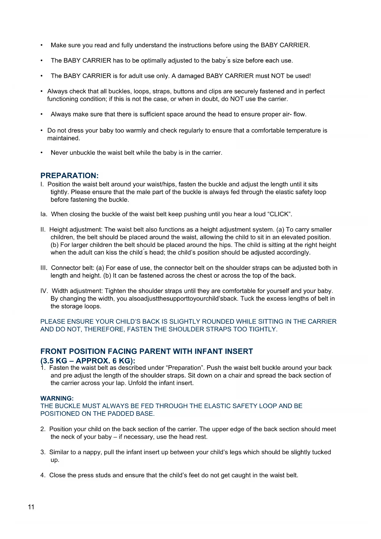 - Make sure you read and fully understand the instructions before using the BABY CARRIER.