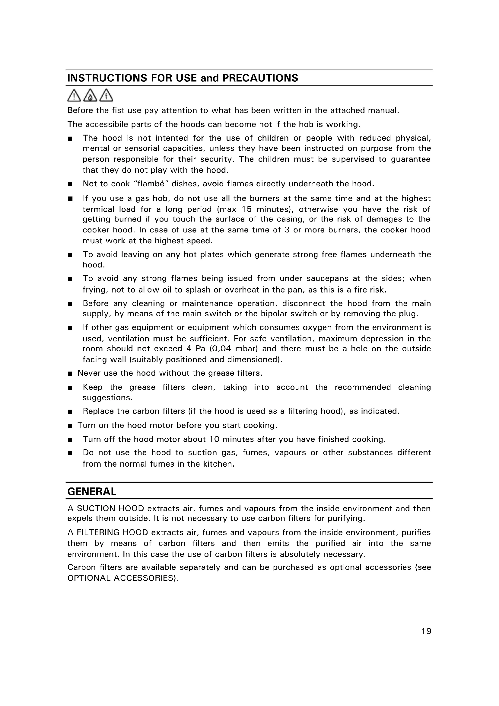 It is absolutely forbidden for the user to connect the air discharge of the hood, when used a suction hood, to boiler chimneys, gas, fume or vapour scavenging chimneys or any other duct, even only ventilation ducts, which have been used or will be used for other devices. Moreover it is not permitted to connect the scavenging pipe for fumes in other adjacent rooms or wellholes, or pipes for fire-fighting devices. In any case it is necessary to respect all norms concerning scavenging of the air. Any user who does not adhere to these instructions is risking his own life and the lives of others. In this case, the manufacturer declines any responsibility.