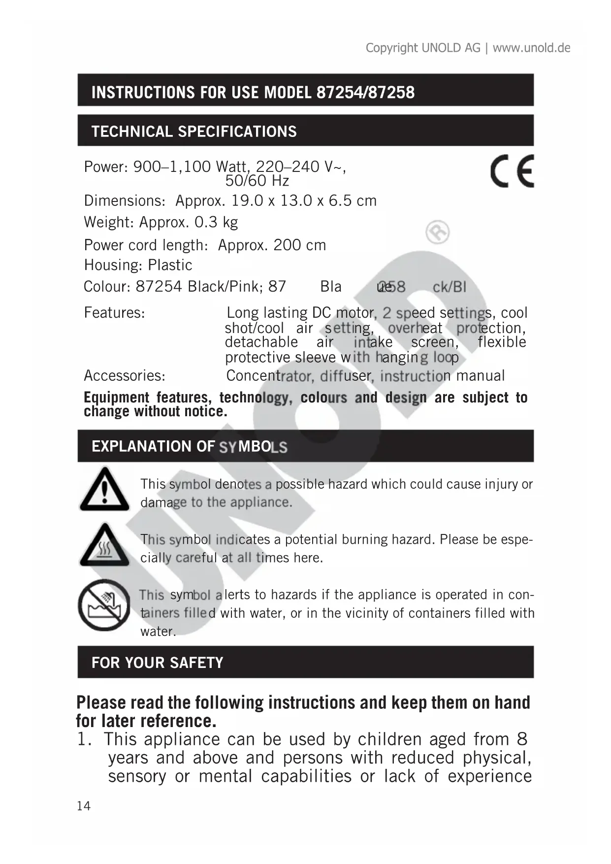 Download the instructions for your Hair dryer in PDF format for free! Find your manual 87258 - UNOLD and take your electronic device back in hand. On this page are published all the documents necessary for the use of your device. 87258 by UNOLD.
