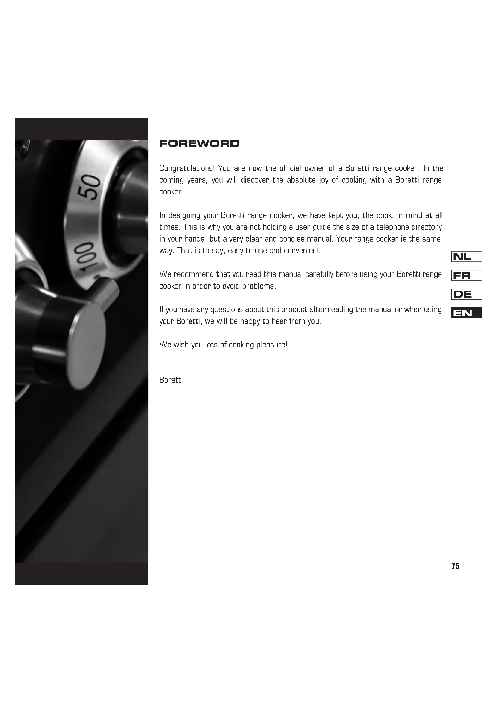 FOREWORD Congratulations! You are now the official owner of a Boretti range cooker. In the coming years, you will discover the absolute joy of cooking with a Boretti range cooker. In designing your Boretti range cooker, we have kept you, the cook, in mind at all times. This is why you are not holding a user guide the size of a telephone directory in your hands, but a very clear and concise manual. Your range cooker is the same way. That is to say, easy to use and convenient. We recommend that you read this manual carefully before using your Boretti range cooker in order to avoid problems. If you have any questions about this product after reading the manual or when using your Boretti, we will be happy to hear from you. We wish you lots of cooking pleasure! Boretti76 Contents Foreword For the Installer 77 – General Installation Instructions – Electrical Connection – Gas Connection Before First Use 79 – Safety Instructions – Environmental Regulations – Cleaning Before First Use Operating the Programmable LCD Clock 81 – Setting the Correct Time – Manual Function – Adjusting the Audio Signal – The Timer – Pre–Programmed Baking Operating the Gas Oven Programmable LCD Clock 83 – Setting the Correct Time – Setting the Timer – Adjusting the Audio Signal Operating the Programmable Analog Clock 84 – Setting the Correct Time – Manual Function – Timer with Automatic Countdown – Pre–Programmed Baking Instructions for Oven Use 85 – Descriptions of the Various Oven Functions – Quick–Start Function – Grill (oven) – Using the Rotisserie – Casing Cooling – Dismantling the Oven Door – Dismantling the Oven Glass Panel – Removing the Inside Panels from the Oven – Cleaning the Oven Cavity(s) – Using the Built–In Thermometer – Pizza Pan Using a Ventilated gas Oven 89 – Igniting the Gas Oven – Gas Oven Grill – Gas Oven Fan The Cooktop 91 – General Information Gas Burners – Wok Burner – Fry Top – Cleaning the Fry Top – Coupe de Feu – Adjusting the Gas Burners – Cast Iron Grill Plate – Cleaning the Cooktop – Ceramic Cooktop – The induction cooker Technical Details 95 – Table for Built–In Thermometer – Troubleshooting – Installation Diagrams – Power and Values77