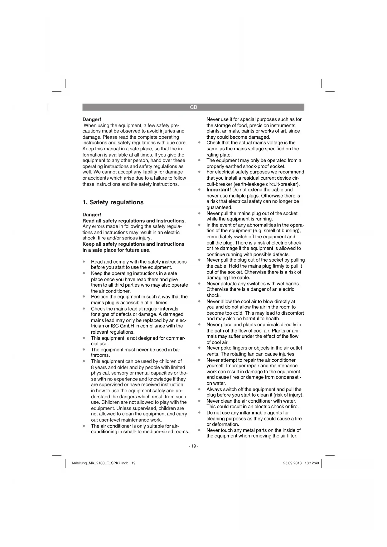 The air-conditioning system is only designed to air-condition dry rooms. The room volume depends on the local conditions. Large window areas, additional heat sources (PC, television, people, etc.), poor wall insulation, etc. serve to reduce this room volume. The equipment is to be used only for its prescribed purpose. Any other use is deemed to be a case of misuse. The user / operator and not the manufacturer will be liable for any damage or injuries of any kind caused as a result of this. Please note that our equipment has not been de- signed for use in commercial, trade or industrial applications. Our warranty will be voided if the machine is used in commercial, trade or industrial businesses or for equivalent purposes.