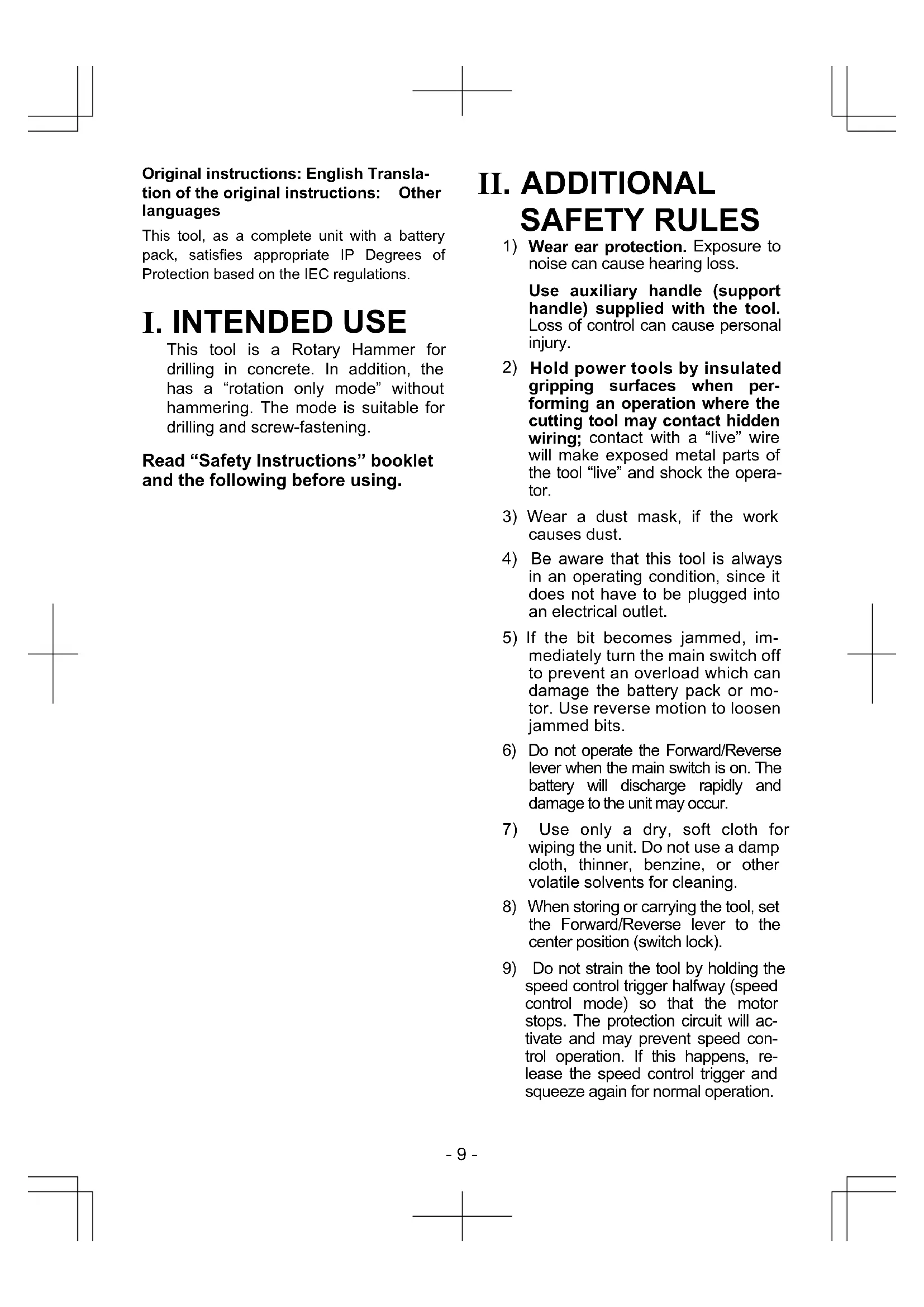 This tool is a Rotary Hammer for drilling in concrete. In addition, the has a “rotation only mode” without hammering. The mode is suitable for drilling and screw-fastening. Read “Safety Instructions” booklet and the following before using.