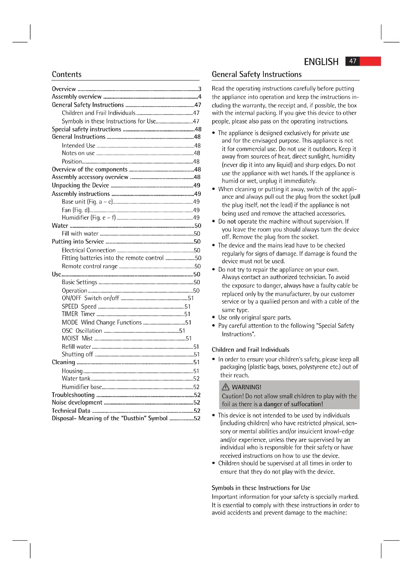 - Do not place the device immediately next to stoves or other sources of heat. CAUTION: The integrated humidier works by ultrasound. This sound may be disturbing to pets. General Instructions Intended Use This appliance can be used as a fan and/or humidier. It is intended exclusively for this purpose and may only be used as such. It may only be used in the manner described in these instructions for use. The device must not be used for commercial purposes. Any other use of this device is considered to be contrary to the intended use and may result in damage to materi- als or even personal injury. The rm ETV - Elektro-Technische Vertriebsgesellschaft mbH does not accept any liability for damage caused as a result of the use of this device contrary to its intended use. Notes on use You can use this appliance to increase the air humidity in a dry environment. This oers the following benets: