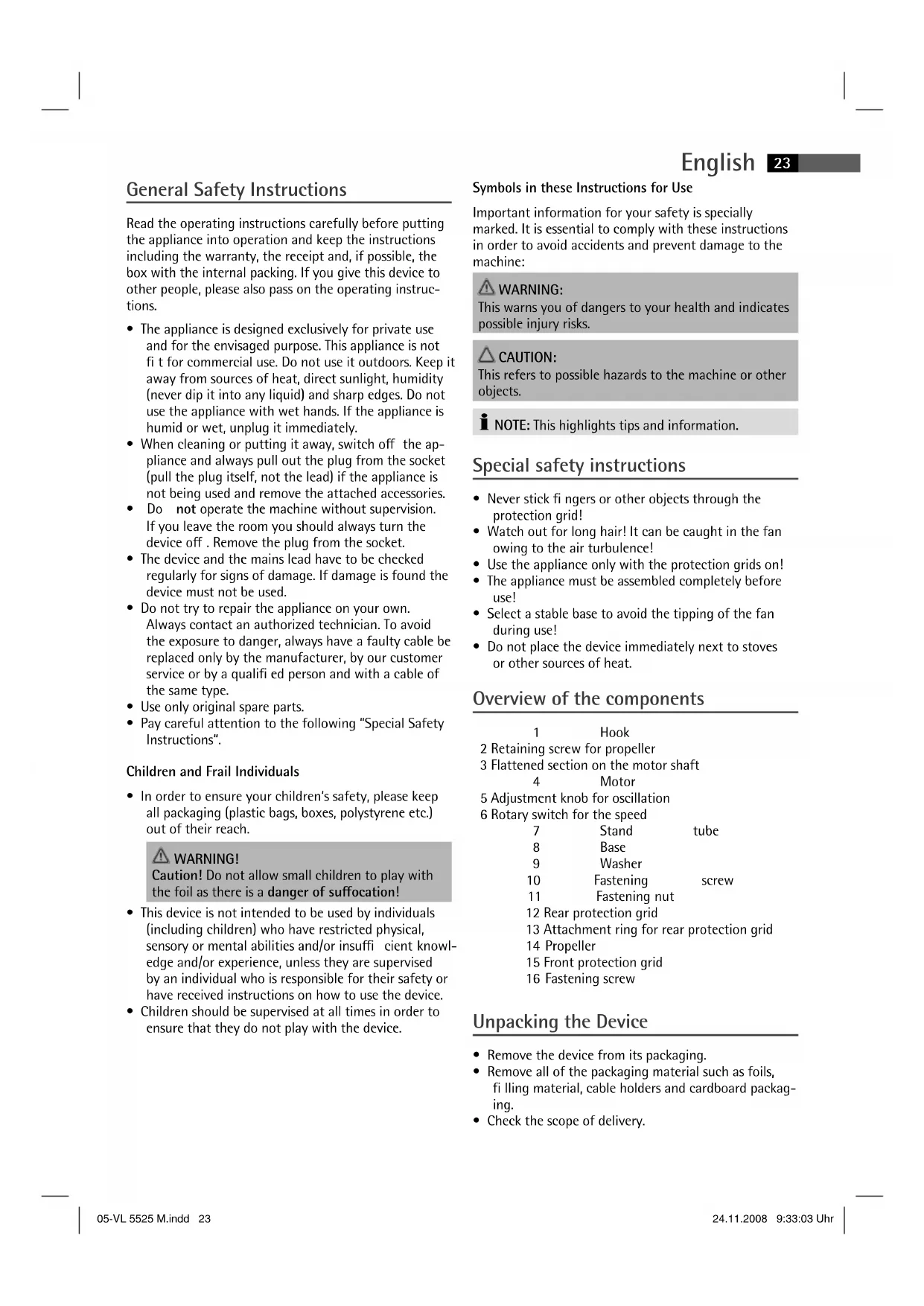 - If the device is very dirty wet a cloth with water and then wipe the device dry once you have nished. Noise development The workplace-related emission value is less than 70 dB(A). 05-VL 5525 M.indd 2405-VL 5525 M.indd 24 24.11.2008 9:33:04 Uhr24.11.2008 9:33:04 UhrEnglish