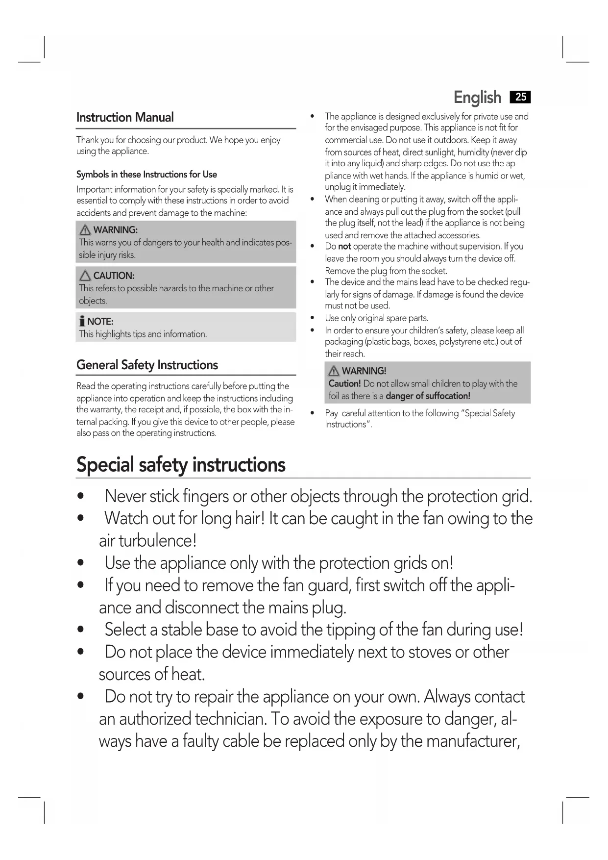 Instruction Manual Thank you for choosing our product. We hope you enjoy using the appliance.Symbols in these Instructions for UseImportant information for your safety is specially marked. It is essential to comply with these instructions in order to avoid accidents and prevent damage to the machine: WARNING: This warns you of dangers to your health and indicates pos-sible injury risks. CAUTION:This refers to possible hazards to the machine or other objects. NOTE: This highlights tips and information. General Safety Instructions Read the operating instructions carefully before putting the appliance into operation and keep the instructions including the warranty, the receipt and, if possible, the box with the in-ternal packing. If you give this device to other people, please also pass on the operating instructions.• Theapplianceisdesignedexclusivelyforprivateuseandfor the envisaged purpose. This appliance is not fit for commercial use. Do not use it outdoors. Keep it away from sources of heat, direct sunlight, humidity (never dip it into any liquid) and sharp edges. Do not use the ap-pliance with wet hands. If the appliance is humid or wet, unplug it immediately. • Whencleaningorputtingitaway,switchofftheappli-ance and always pull out the plug from the socket (pull the plug itself, not the lead) if the appliance is not being used and remove the attached accessories.• Donot operate the machine without supervision. If you leave the room you should always turn the device off. Remove the plug from the socket.• Thedeviceandthemainsleadhavetobecheckedregu-larly for signs of damage. If damage is found the device must not be used.• Useonlyoriginalspareparts.• Inordertoensureyourchildren’ssafety,pleasekeepallpackaging (plastic bags, boxes, polystyrene etc.) out of their reach. WARNING! Caution! Do not allow small children to play with the foil as there is a danger of suffocation!• Paycarefulattentiontothefollowing“SpecialSafetyInstructions”. Special safety instructions