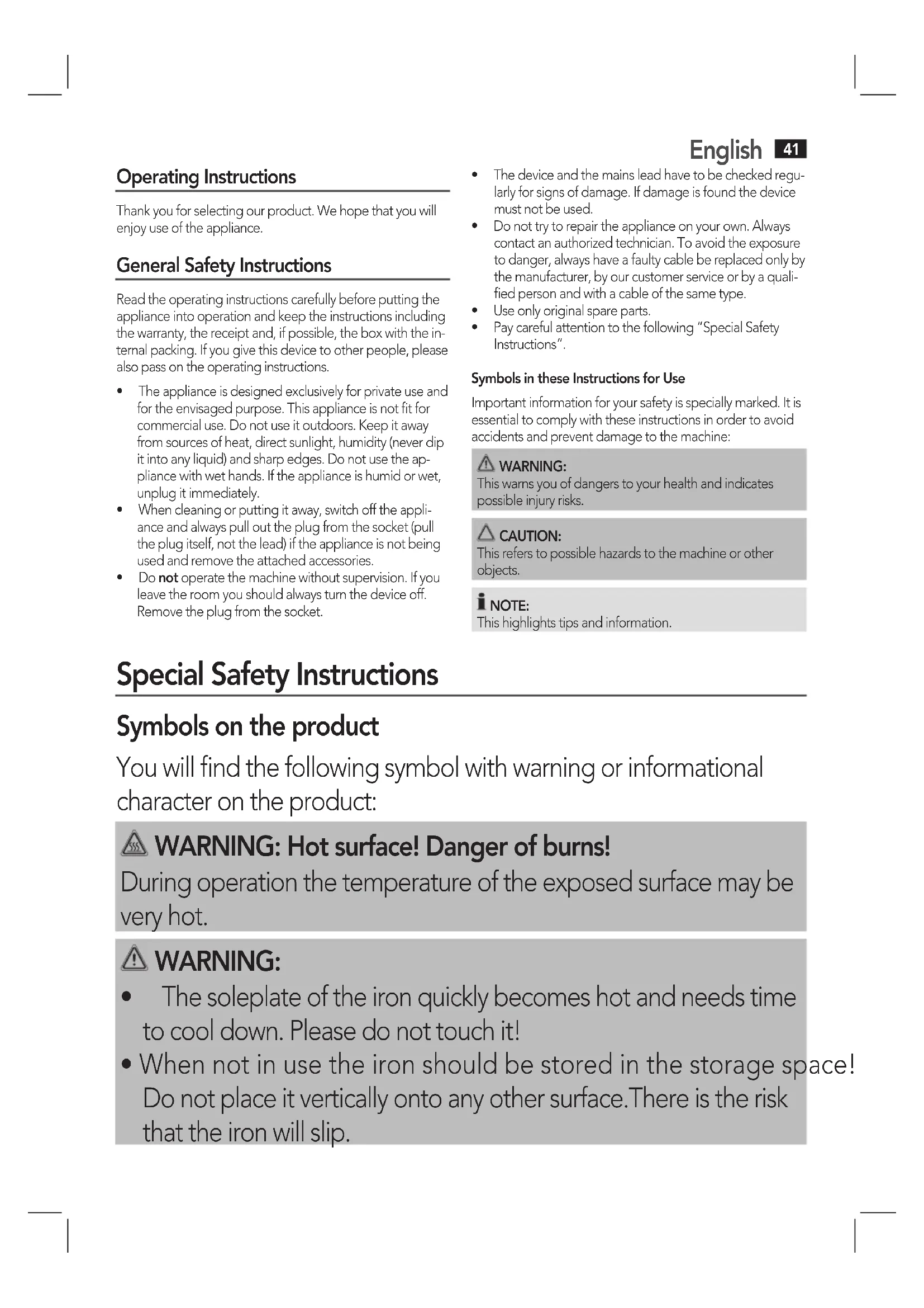 Operating Instructions Thank you for selecting our product. We hope that you will enjoy use of the appliance. General Safety Instructions Read the operating instructions carefully before putting the appliance into operation and keep the instructions including the warranty, the receipt and, if possible, the box with the in-ternal packing. If you give this device to other people, please also pass on the operating instructions.• Theapplianceisdesignedexclusivelyforprivateuseandfor the envisaged purpose. This appliance is not fit for commercial use. Do not use it outdoors. Keep it away from sources of heat, direct sunlight, humidity (never dip it into any liquid) and sharp edges. Do not use the ap-pliance with wet hands. If the appliance is humid or wet, unplug it immediately.• Whencleaningorputtingitaway,switchofftheappli-ance and always pull out the plug from the socket (pull the plug itself, not the lead) if the appliance is not being used and remove the attached accessories.• Donot operate the machine without supervision. If you leave the room you should always turn the device off. Remove the plug from the socket. • Thedeviceandthemainsleadhavetobecheckedregu-larly for signs of damage. If damage is found the device must not be used.• Donottrytorepairtheapplianceonyourown.Alwayscontact an authorized technician. To avoid the exposure to danger, always have a faulty cable be replaced only by the manufacturer, by our customer service or by a quali-fied person and with a cable of the same type.• Useonlyoriginalspareparts.• Paycarefulattentiontothefollowing“SpecialSafetyInstructions“.Symbols in these Instructions for UseImportant information for your safety is specially marked. It is essential to comply with these instructions in order to avoid accidents and prevent damage to the machine: WARNING:This warns you of dangers to your health and indicates possible injury risks. CAUTION:This refers to possible hazards to the machine or other objects. NOTE:This highlights tips and information. Special Safety Instructions Symbols on the product You will find the following symbol with warning or informational character on the product:
