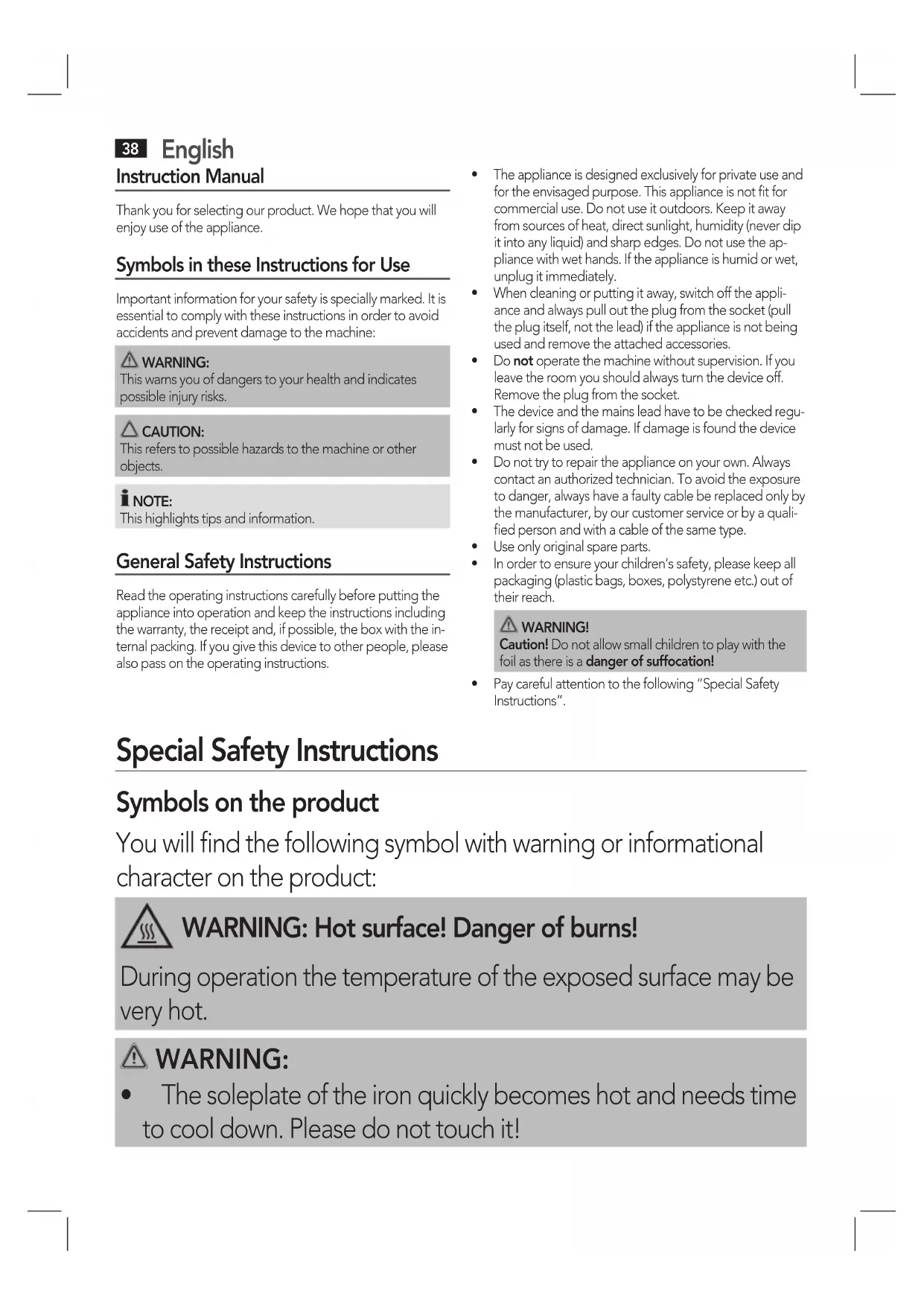 - Theapplianceisdesignedexclusivelyforprivateuseandfor the envisaged purpose. This appliance is not fit for commercial use. Do not use it outdoors. Keep it away from sources of heat, direct sunlight, humidity (never dip it into any liquid) and sharp edges. Do not use the ap-pliance with wet hands. If the appliance is humid or wet, unplug it immediately.• Whencleaningorputtingitaway,switchofftheappli-ance and always pull out the plug from the socket (pull the plug itself, not the lead) if the appliance is not being used and remove the attached accessories.• Donot operate the machine without supervision. If you leave the room you should always turn the device off. Remove the plug from the socket.• Thedeviceandthemainsleadhavetobecheckedregu-larly for signs of damage. If damage is found the device must not be used.• Donottrytorepairtheapplianceonyourown.Alwayscontactanauthorizedtechnician.Toavoidtheexposureto danger, always have a faulty cable be replaced only by the manufacturer, by our customer service or by a quali-fied person and with a cable of the same type.• Useonlyoriginalspareparts.• Inordertoensureyourchildren‘ssafety,pleasekeepallpackaging(plasticbags,boxes,polystyreneetc.)outoftheir reach. WARNING! Caution! Do not allow small children to play with the foil as there is a danger of suffocation!• Paycarefulattentiontothefollowing“SpecialSafetyInstructions“. Special Safety Instructions Symbols on the product You will find the following symbol with warning or informational character on the product: