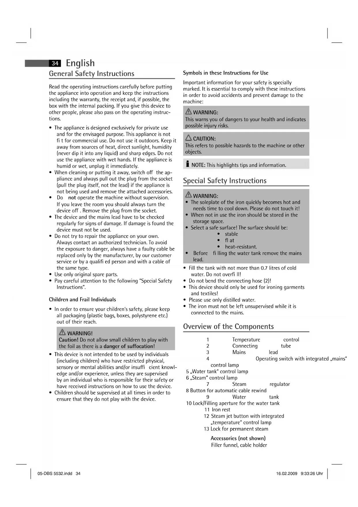 The iron expels a large quantity of hot steam. Danger of burns. CAUTION: When using the steam iron please ensure that the wa- ter tank is always lled to the required level. Operating the device without water will damage it. 05-DBS 5532.indd 3505-DBS 5532.indd 35 16.02.2009 9:33:27 Uhr16.02.2009 9:33:27 UhrEnglish