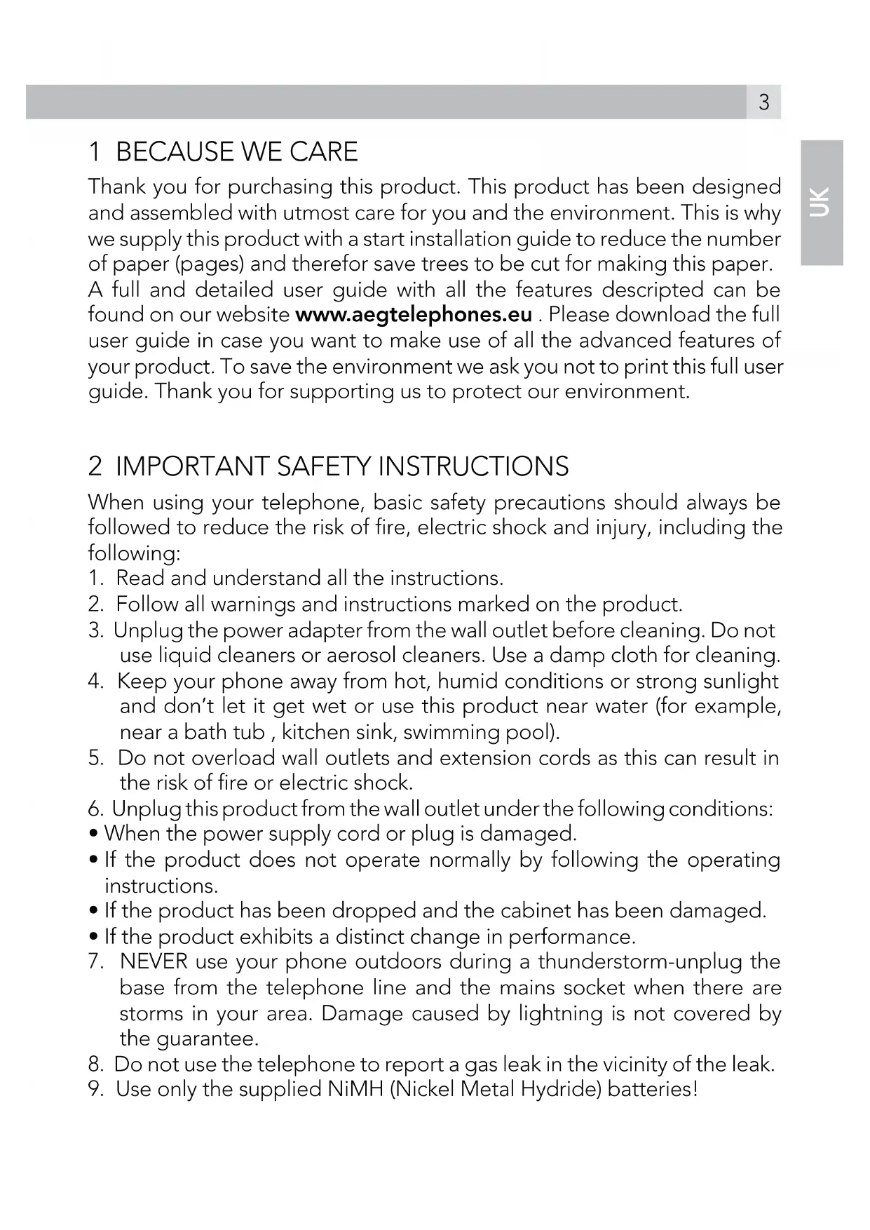 Thank you for purchasing this product. This product has been designed and assembled with utmost care for you and the environment. This is why we supply this product with a start installation guide to reduce the number of paper (pages) and therefor save trees to be cut for making this paper. A full and detailed user guide with all the features descripted can be found on our website www.aegtelephones.eu . Please download the full user guide in case you want to make use of all the advanced features of your product. To save the environment we ask you not to print this full user guide. Thank you for supporting us to protect our environment.