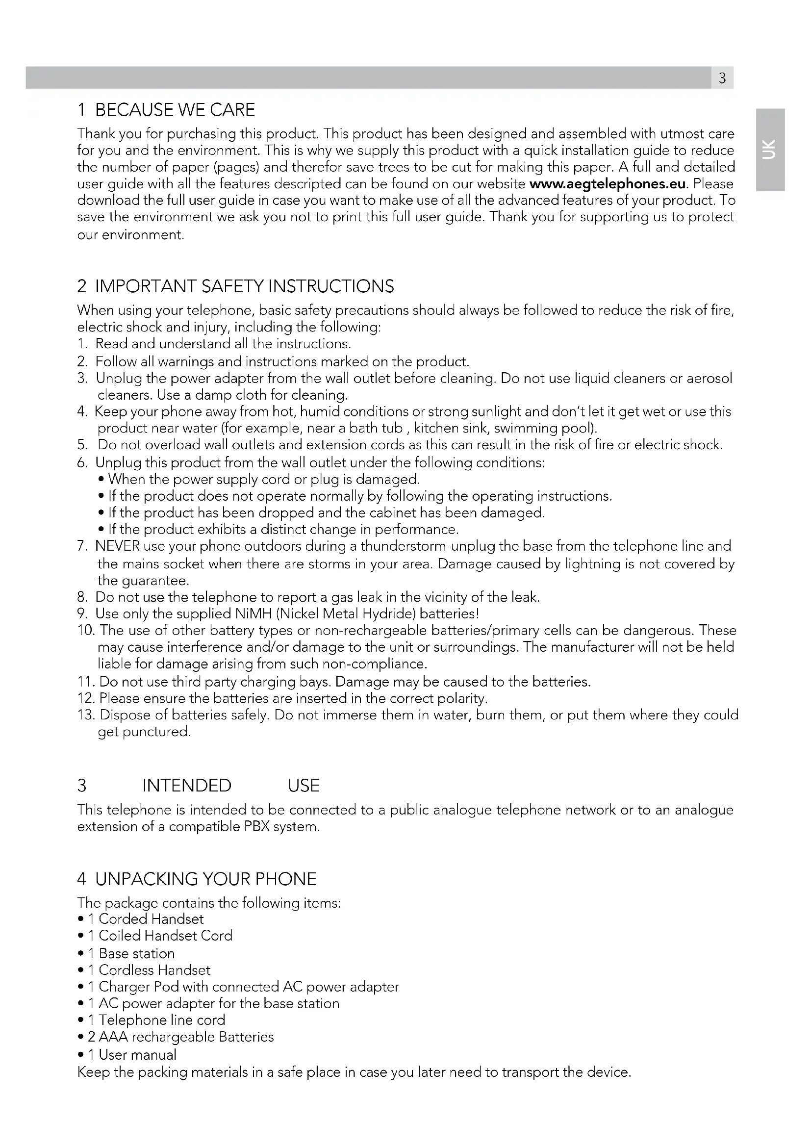 Thank you for purchasing this product. This product has been designed and assembled with utmost care for you and the environment. This is why we supply this product with a quick installation guide to reduce the number of paper (pages) and therefor save trees to be cut for making this paper. A full and detailed user guide with all the features descripted can be found on our website www.aegtelephones.eu. Please download the full user guide in case you want to make use of all the advanced features of your product. To save the environment we ask you not to print this full user guide. Thank you for supporting us to protect our environment.