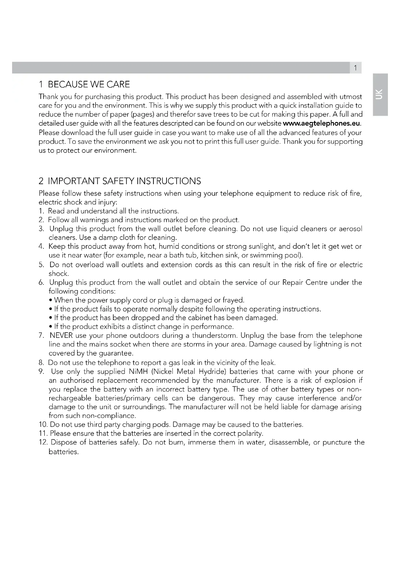 Thank you for purchasing this product. This product has been designed and assembled with utmost care for you and the environment. This is why we supply this product with a quick installation guide to reduce the number of paper (pages) and therefor save trees to be cut for making this paper. A full and detailed user guide with all the features descripted can be found on our website www.aegtelephones.eu. Please download the full user guide in case you want to make use of all the advanced features of your product. To save the environment we ask you not to print this full user guide. Thank you for supporting us to protect our environment.