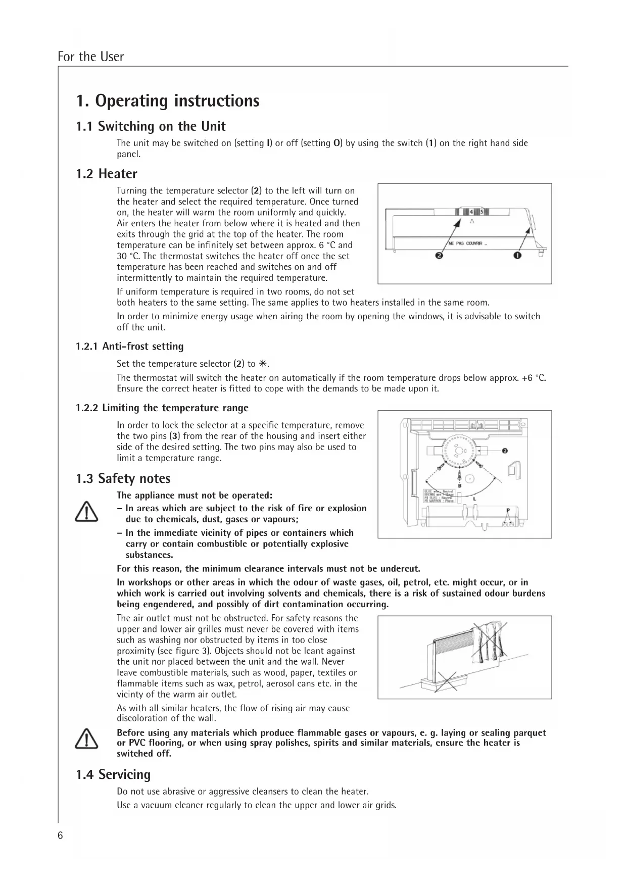 Turning the temperature selector (2) to the left will turn on the heater and select the required temperature. Once turned on, the heater will warm the room uniformly and quickly. Air enters the heater from below where it is heated and then exits through the grid at the top of the heater. The room temperature can be infinitely set between approx. 6^ and 30^ . The thermostat switches the heater off once the set temperature has been reached and switches on and off intermittently to maintain the required temperature.